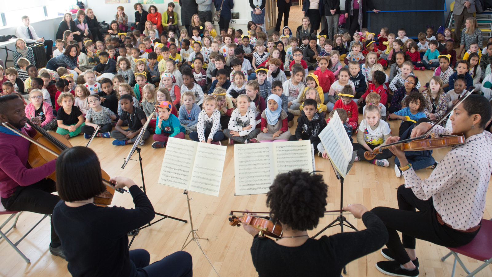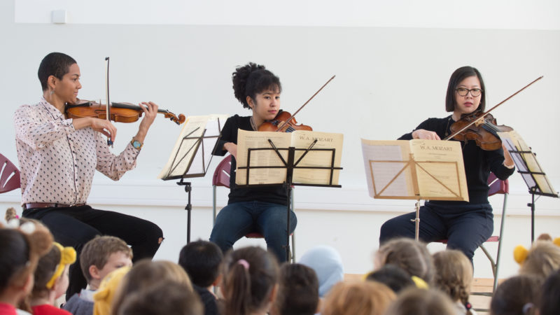 A Chineke! Orchestra string quartet performing to school children from Redfield School