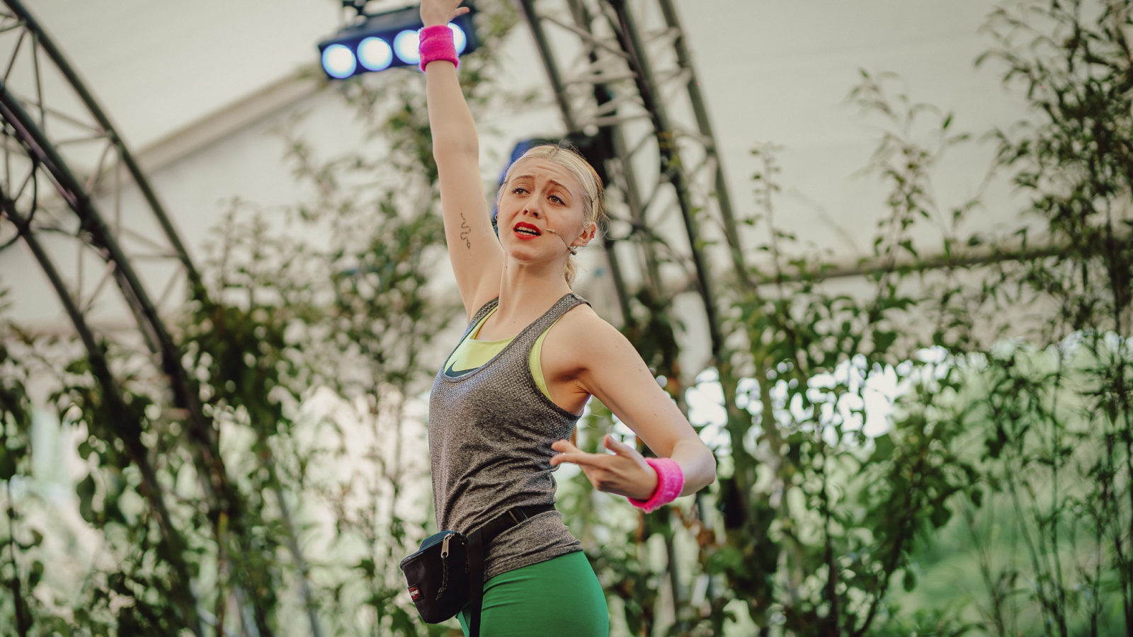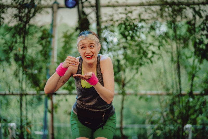 “The zumba instructor element was inspired by a class I did with my mum many years back – and the idea that a super peppy, positive, smiley instructor could have a bit of darkness within them, or the idea that they were just hating life teaching the classes.”