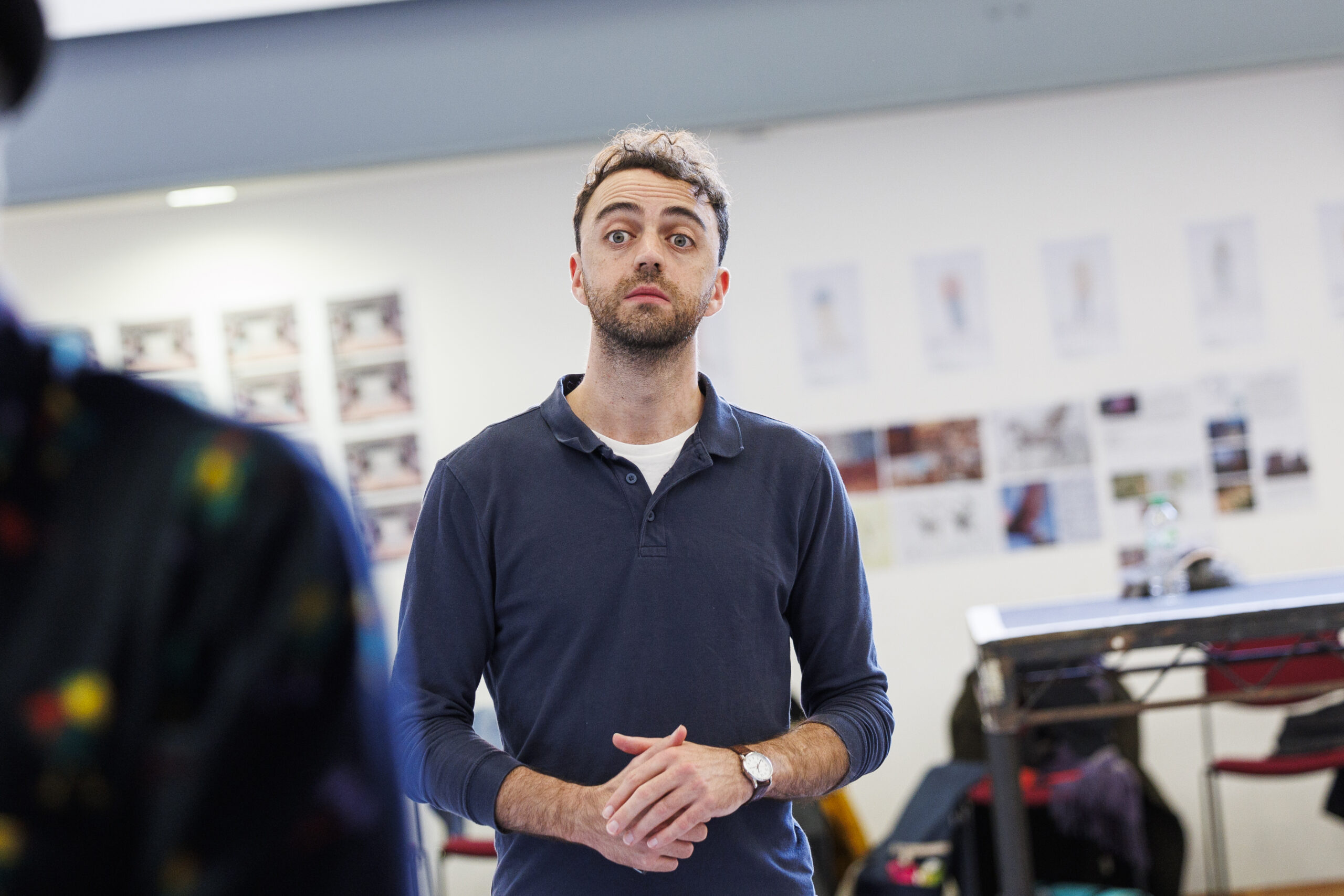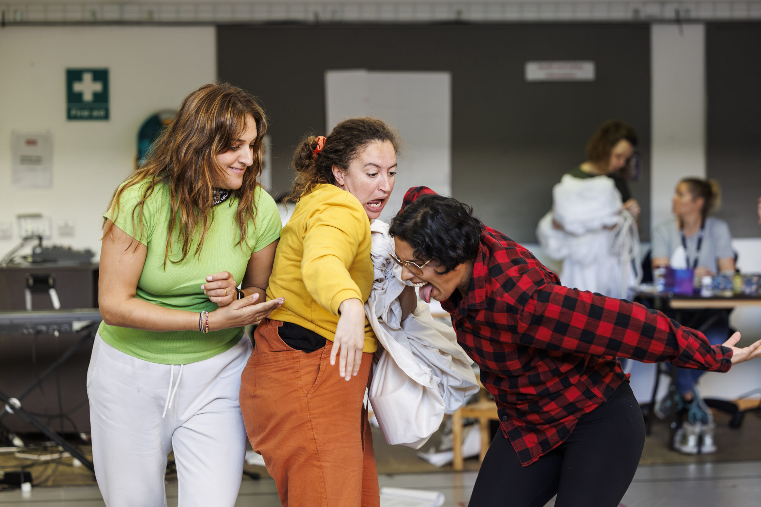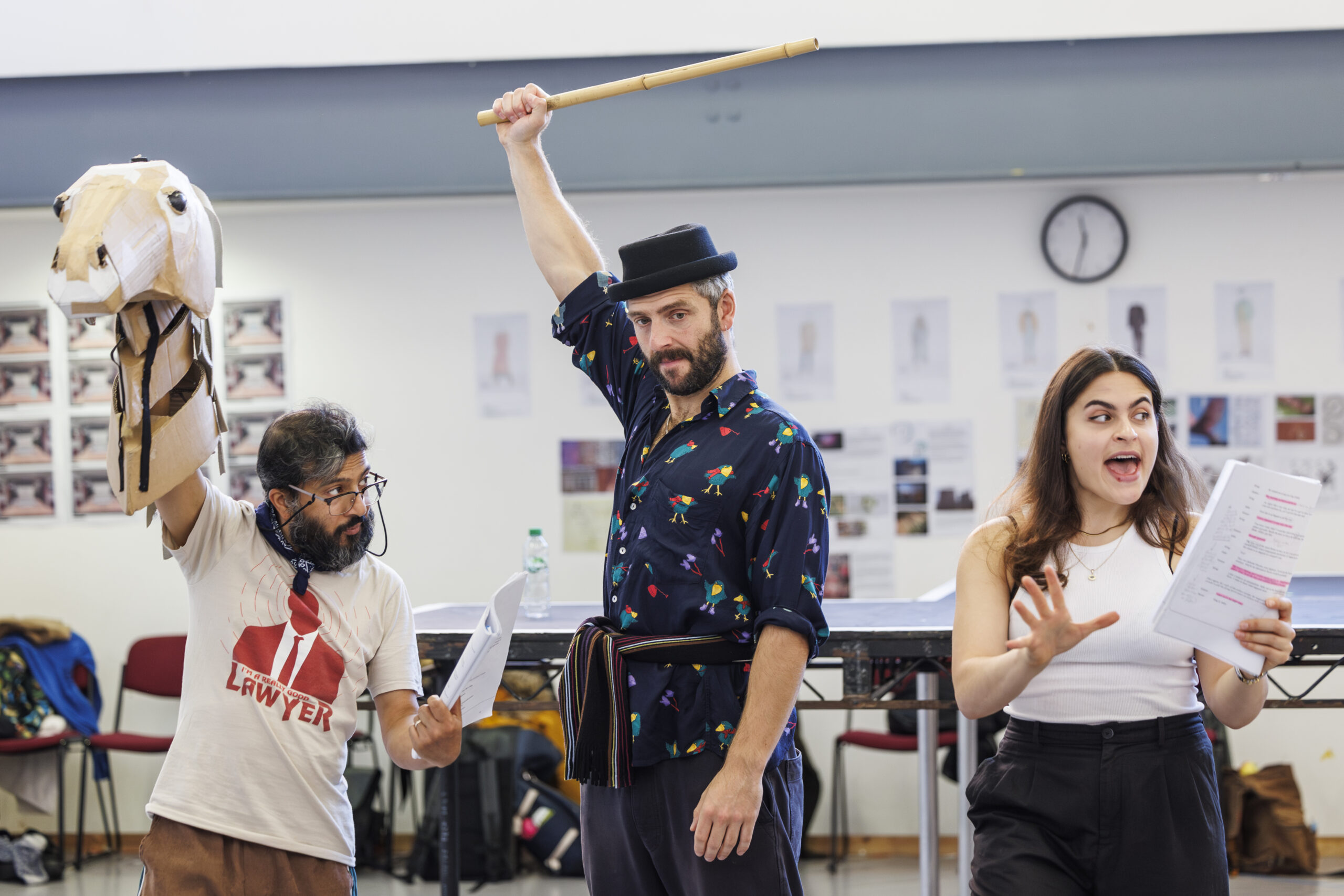 In rehearsal for Arabian Nights, Bristol Old Vic. (l-r) Saikat Ahamed, Nicholas Karimi, Yasemin Özdemir – photo: Ellie Kurttz