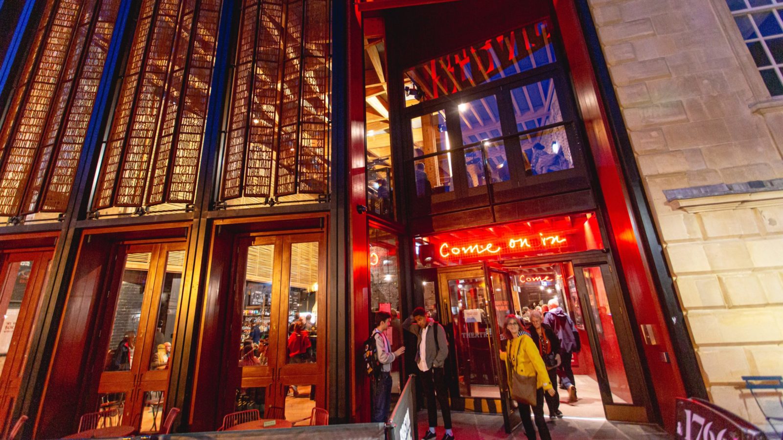 ‘Come on in’ invite the neon lights above the front door to the Bristol Old Vic foyer.