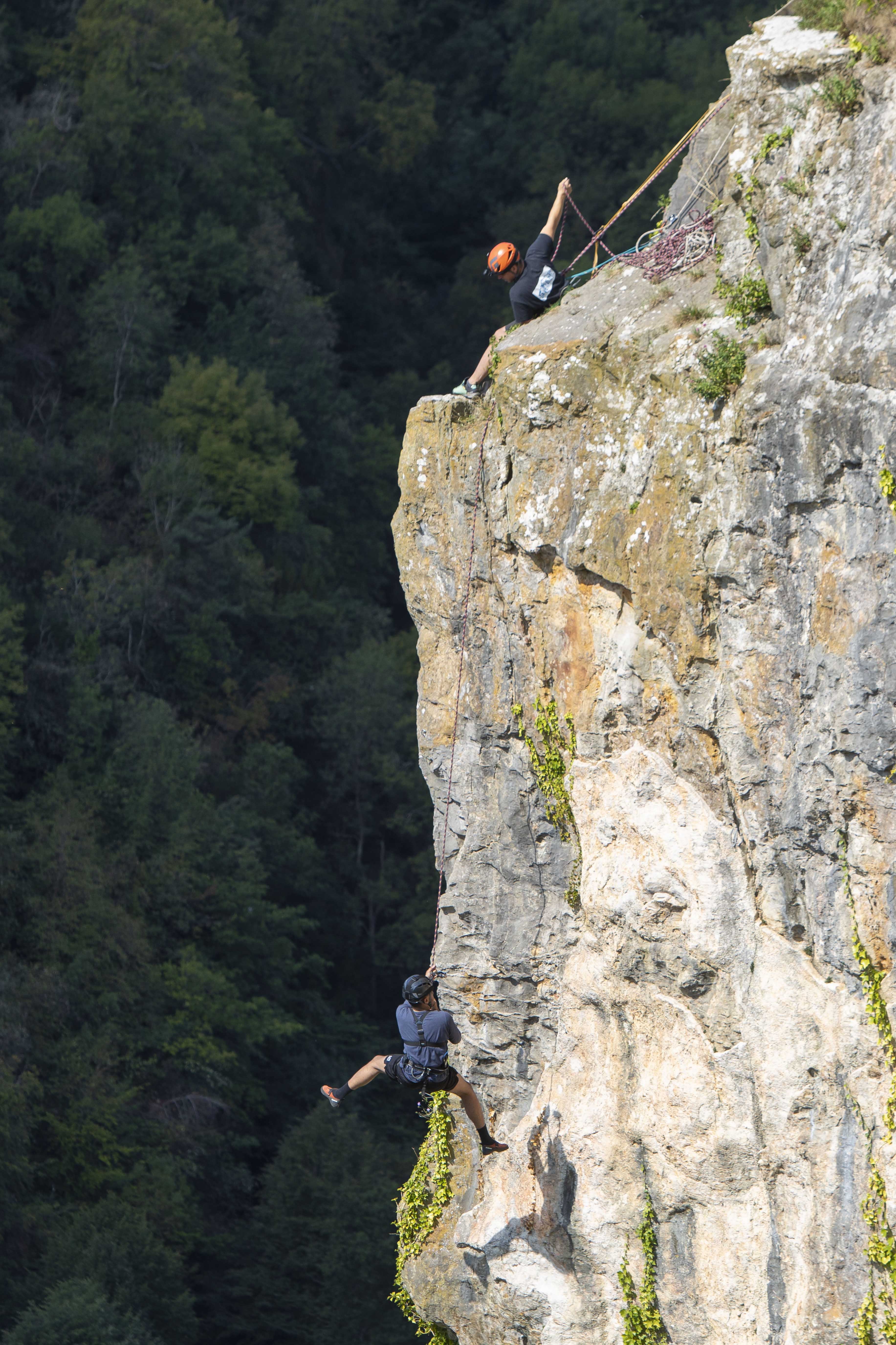 Recreating a now world famous moment of this descent, actor Josh Williams – who plays Simpson – is being lowered down over the side of the Avon Gorge by Touching the Void climbing consultant Dave Talbot.