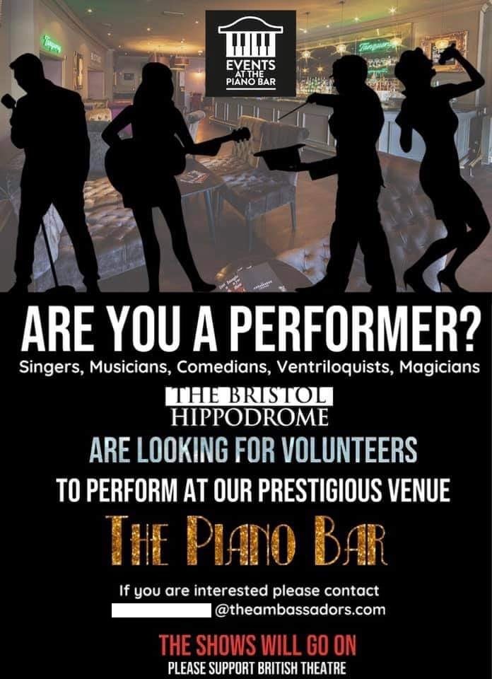‘Please support British theatre’ were the words at the bottom of a flyer advertising for performers to appear at the Bristol Hippodrome’s recently reopened Piano Bar.
