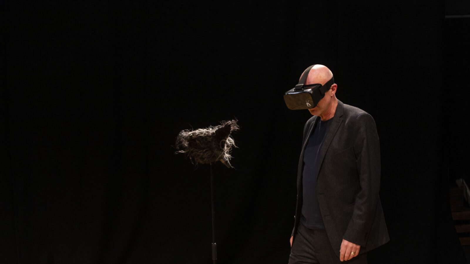 The house lights never go down in Tim Crouch’s Truth’s a Dog’s Must to Kennel. He is alone onstage – with the exception of a BSL interpreter – wearing black clothes and a VR headset, and generates and maintains the world of the piece entirely, aided by occasional background music alone.