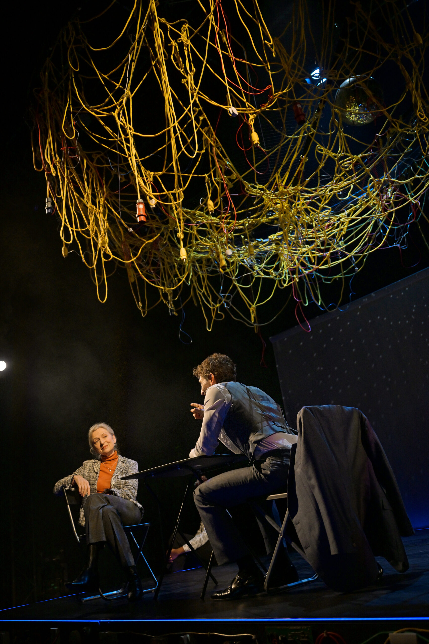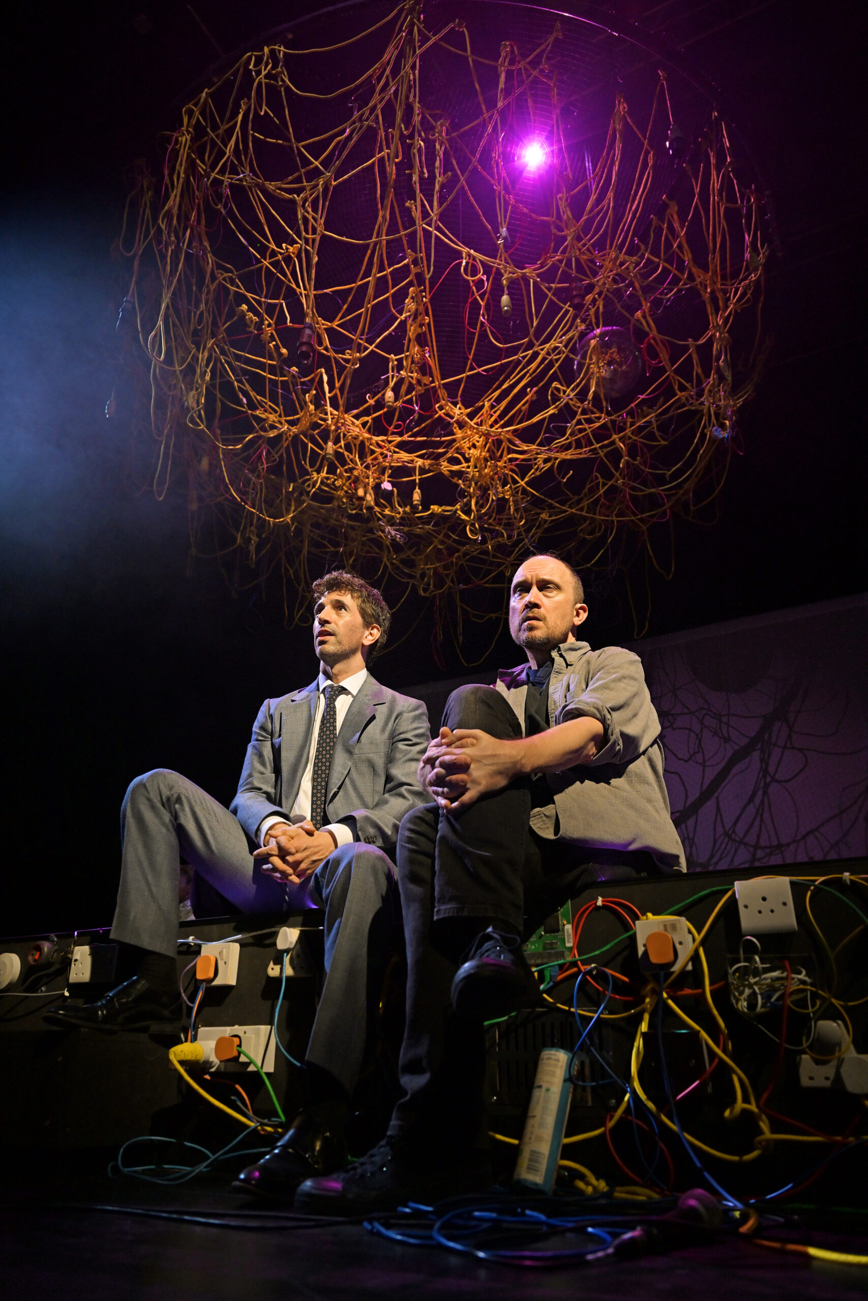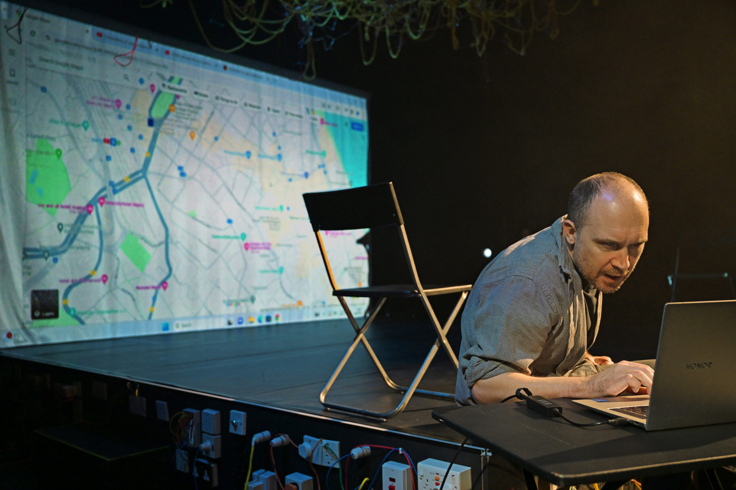 The simple, square stage is lined by a gnarly volume of sockets and plugs. Above the space hovers a dense cluster of yellow wiring. Much like the topic: it’s a real pickle to untangle. Scene settings are shown briefly on the white sheet behind the stage, which doubles as a surface for videos of blasts and Nukemap demonstrations on which Thorpe commentates at intervals.