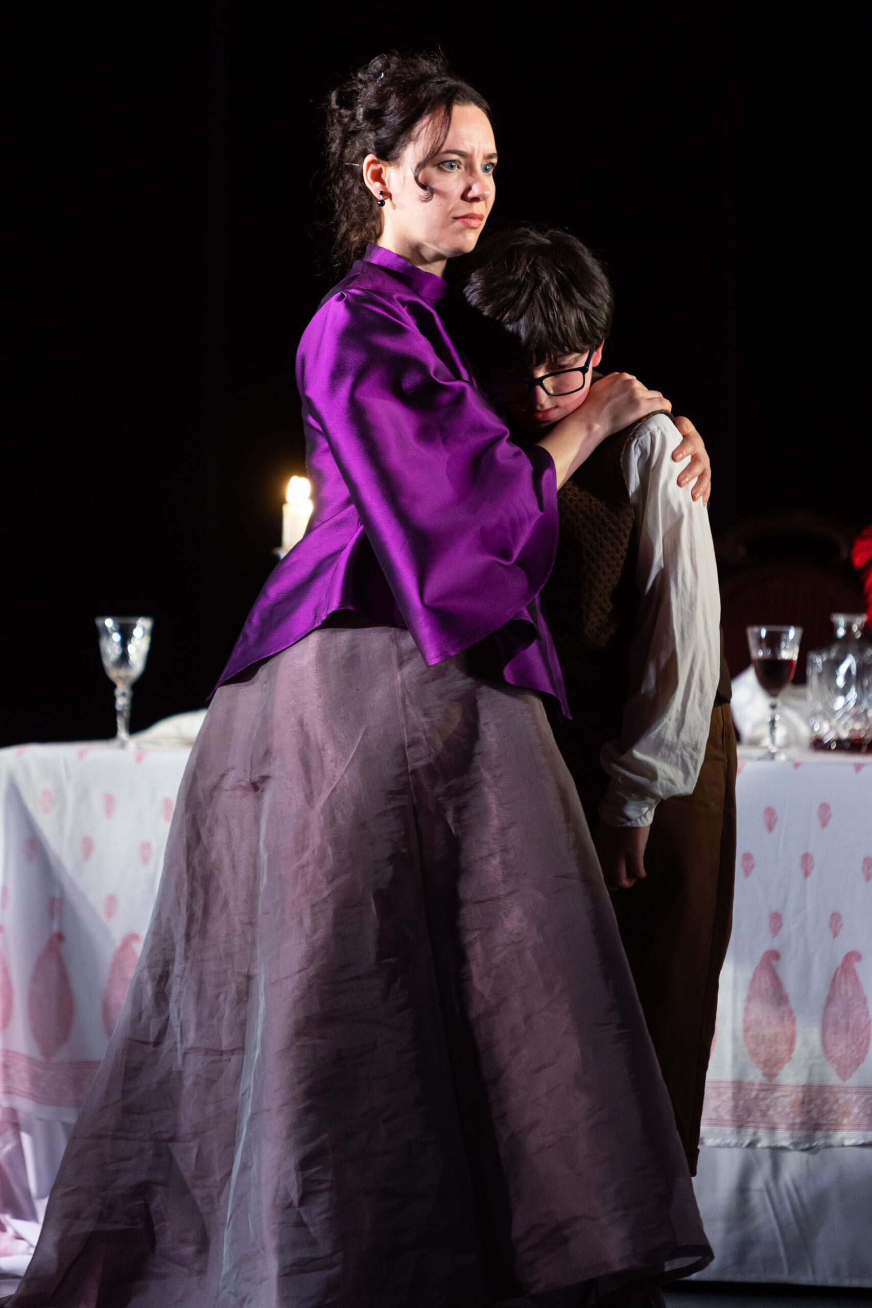 In terms of staging, this is a very modern production – a minimal set, lots of space, an almost continuous soundscape and a weird spiky sculpture dangling overhead which looks great in the production shots but is otherwise completely inexplicable. The design doesn’t entirely seem to have the courage of its convictions – if you’re doing stripped-down suggestion rather than full-blown realism, why bother with the frou-frou of a 19th century dinner table, or a fully-made bed? Trundling these little slabs of realism on and off stage also makes for some very long scene changes.