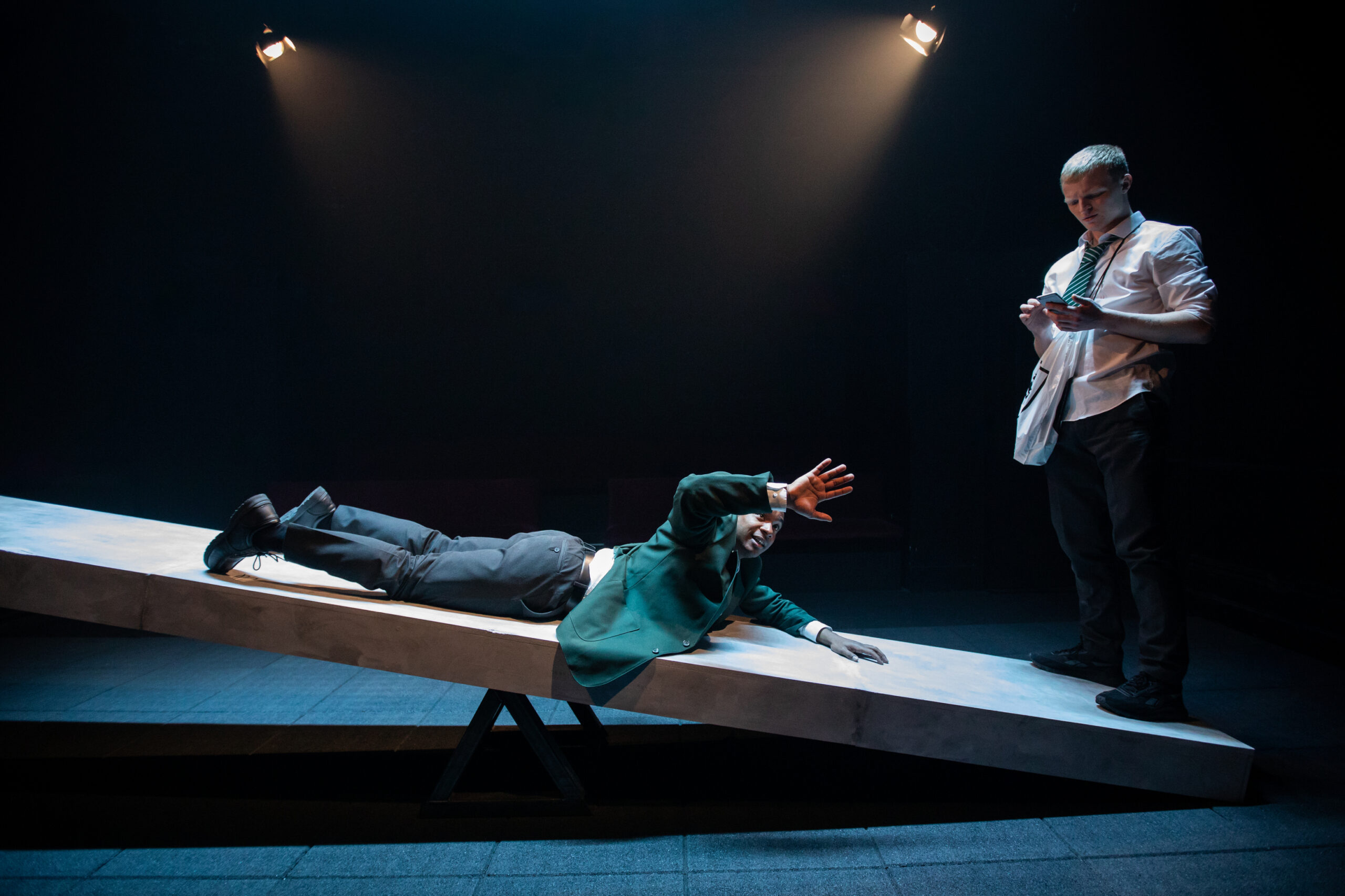 Stage design can make or break a small show like this, but in Bacon, set designer Natalie Johnson’s choices are elegant in its simplicity. The Weston Studio at Bristol Old Vic is a thrust stage, with the audience on all three sides as well as looking down from the balcony. The stage space is set up with a large, concrete-like seesaw facing diagonally across the stage.