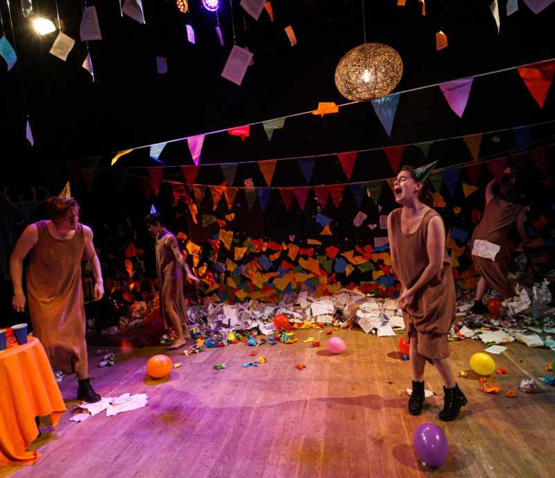 Unlike conventional plays, this production lacks fixed dramatis personae but tests the limits of the cast for slick and seamless character changes and costume changes. The cast consists of the highly polished triumvirate Finn Harkin, Matthew Kay and Alicia Pollard. The evening begins with the strumming of an acoustic guitar and the sung refrain, “Let us be who we want to BE.”