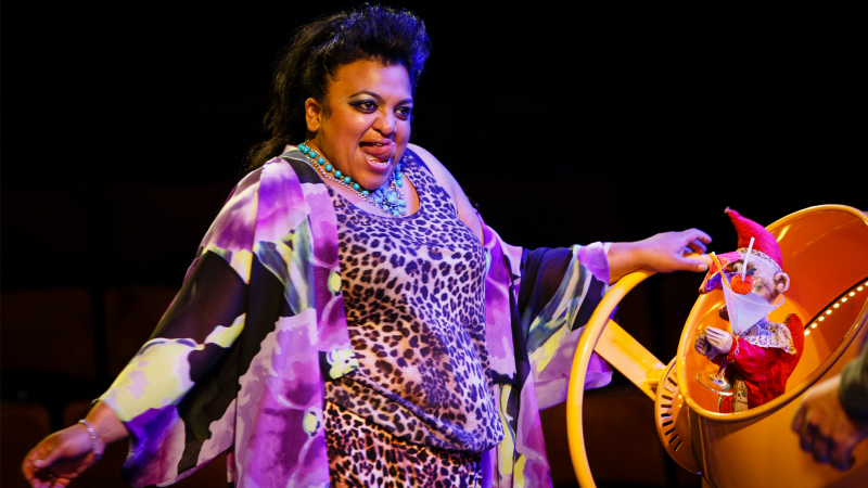 As a musical, Dead Dog… delivers its desolate commentary on the human condition in a highly theatrical, cartoonish style of rich farce. It does so against a dense aural landscape which combines a live soundtrack with an array of musical styles, ranging from Billie Holliday through Ian Dury to death metal delivered through a megaphone. The overall effect is, frankly, insane: a cacophony of bright colours, heightened performances and fantastic puppetry.