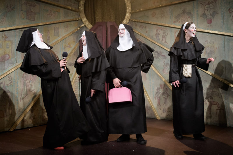 Corrina Buchan is spectacular as Count Dracula (among many other roles), working the room with a cape and strap on cock. Equally impressive performances come from Tom Fletcher as a washed-up, karaoke-loving Van Helsing, Alice Lamb as Frances, a nun who has spent her life in the convent and is prone to bursts of rage and foul language, and Caitlin Campbell as an ever-so-English uptight woman who embarks on a rescue mission with the hapless nun.