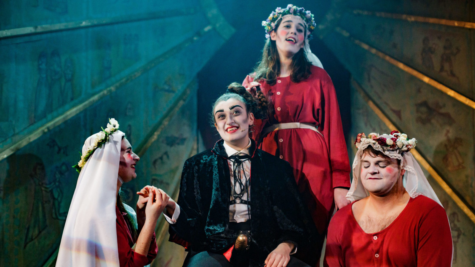 The compact setting of The Wardrobe Theatre is transformed into Transylvania with a coffin-shaped door as the backdrop, surrounded by walls that – if you look carefully – are covered with pictures of naked men and women, pouring blood and more.