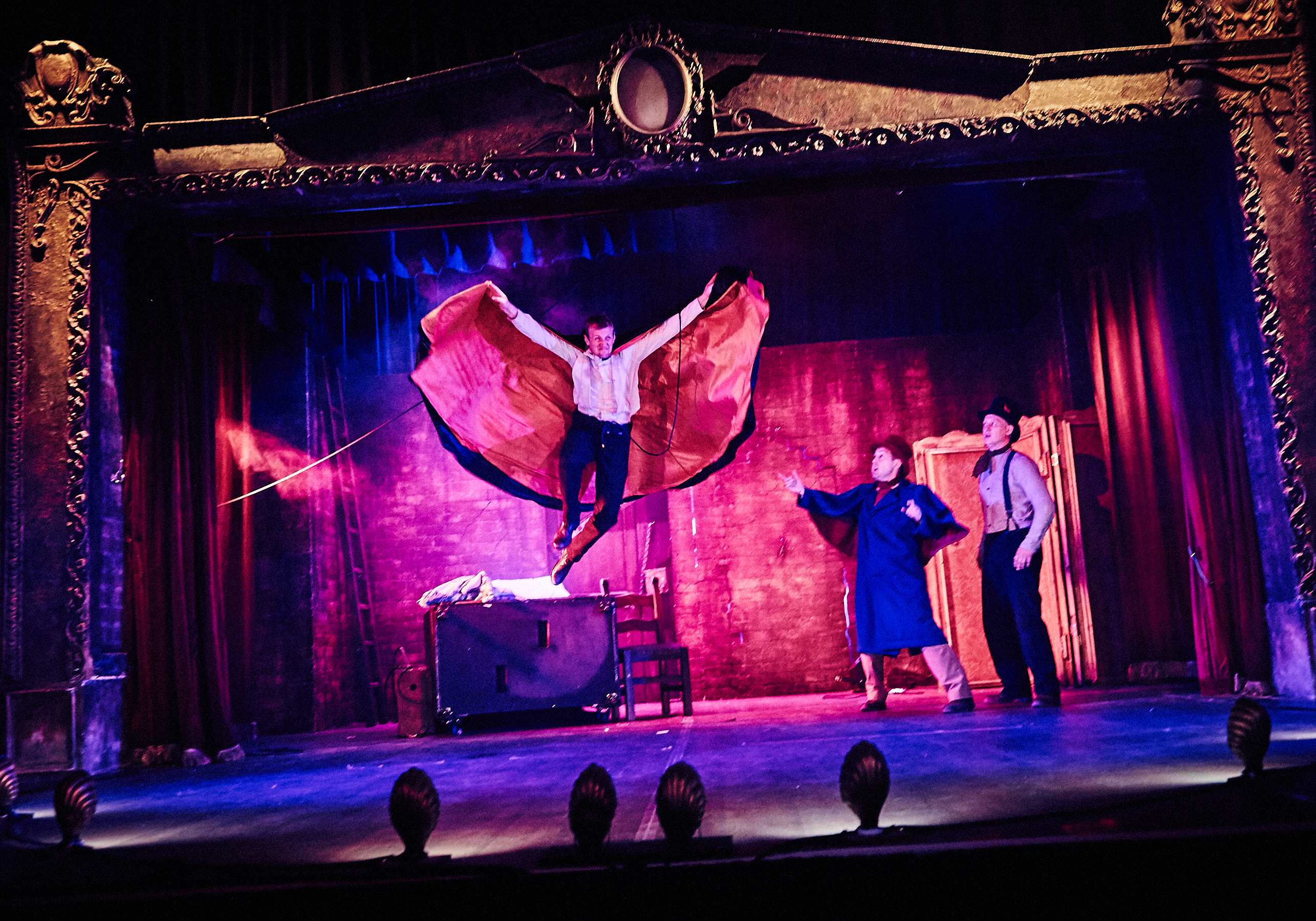 The set is a treat for anyone who loves dusty old theatrical traditions, and the hidden mechanics of the proscenium go on to star heavily in the ensuing onstage shenanigans (spoiler alert: if you look like an innocent twit who likes to help out when things go wrong, sit in the front row). The faded curtains part to reveal a promising first scene replete with theatrical magic, fast tricks and illusions.