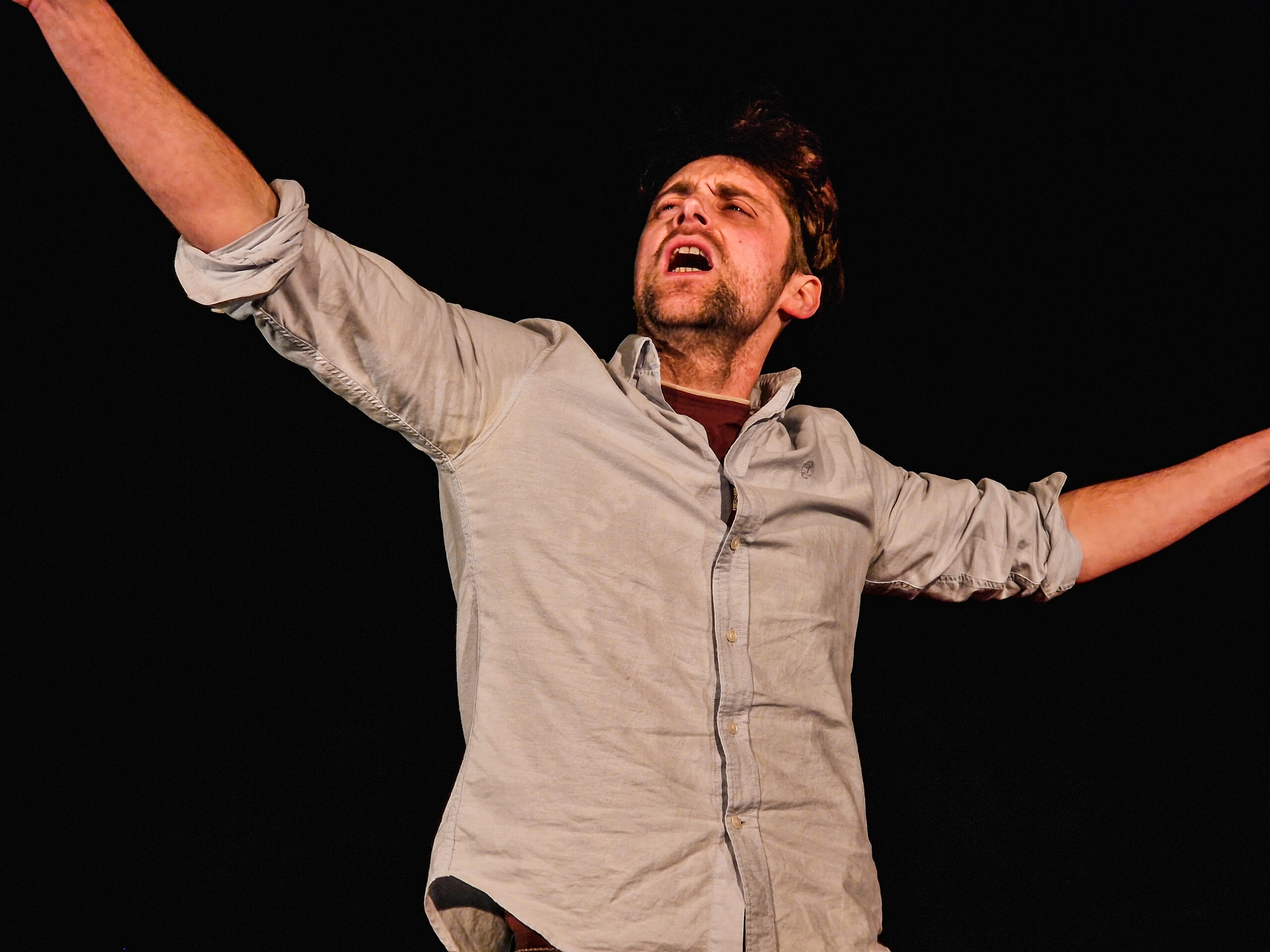 The action moves at a rapid pace, and the juxtapositions are met with approving laughter from the audience: from the commuting passenger audibly chomping a chicken sandwich, to the exasperated protagonist, angered into performing an outlandish impersonation of a chicken on the train.