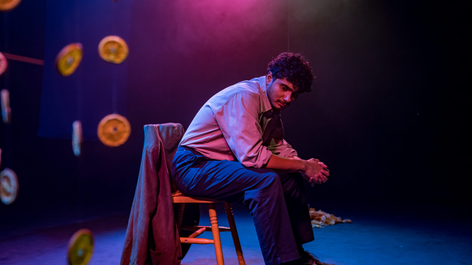 A simple and effective set design by Jida Akil contains plenty of hidden surprises within the orange slices arranged in piles on the floor and a partly draped frame hinting at a later story reveal.