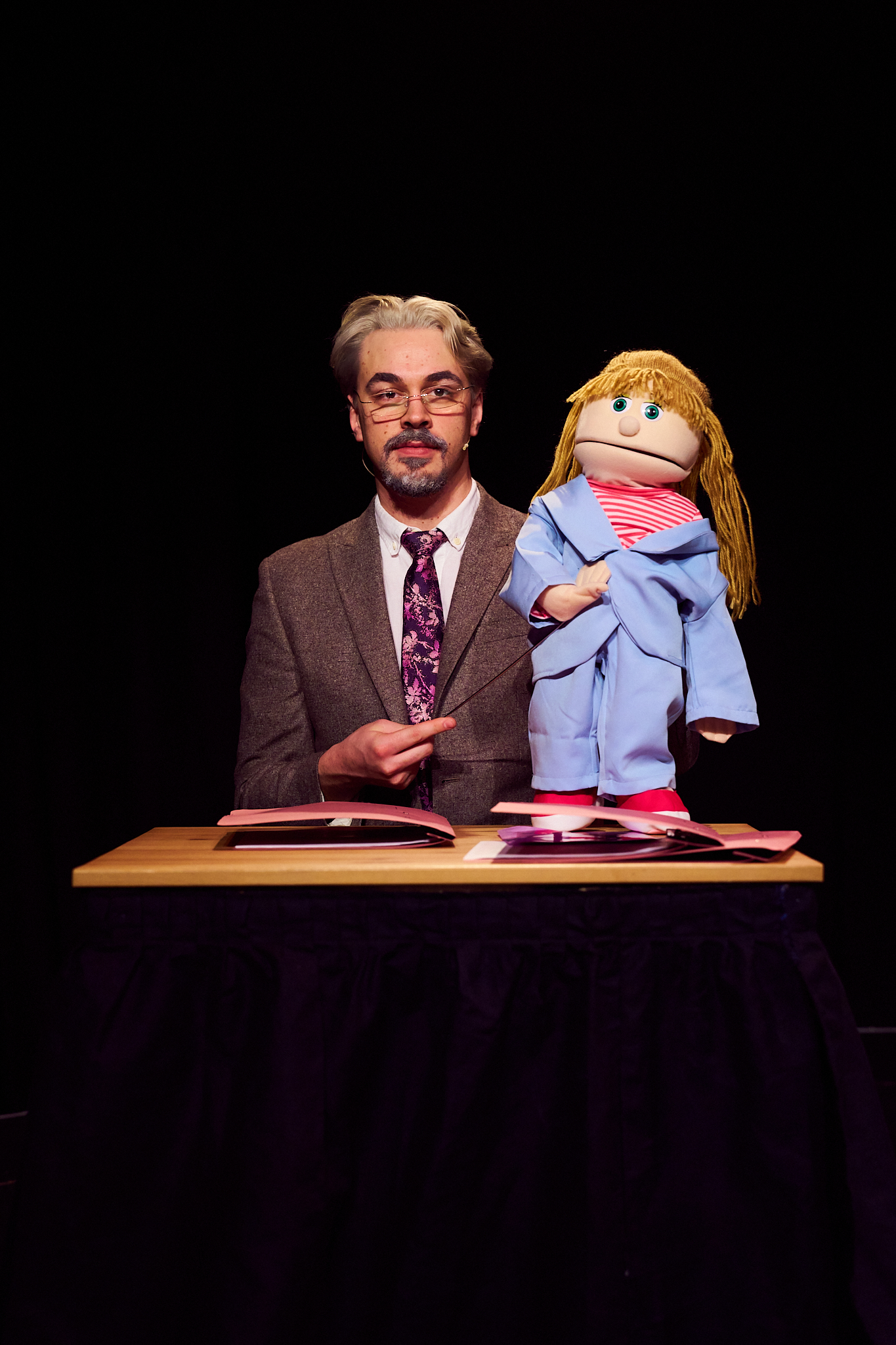 Joseph Martin does double duty as he voices Sanderson’s lawyer, Kristin VanOrman, who appears as a puppet.