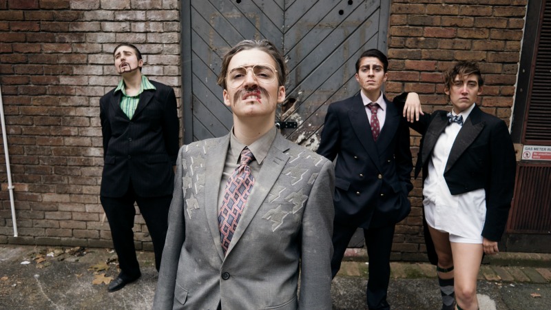 The four members of The Great White Males look like they’ve just walked out of one of Diane Torr’s Man For A Day drag-king workshops, and in the true spirit of female to male cross-dressing, they look so wrong they look right: the facial hair is too linear, the collars too pointy, the eyebrows too mono, the jawlines too slack and the crotches so bulgey they must be smuggling badgers, not budgies.