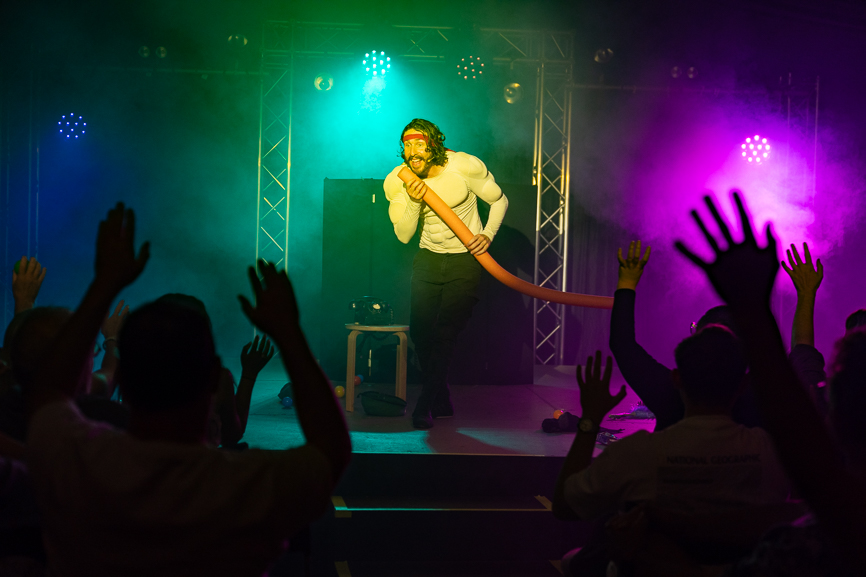 The performance wraps up with the audience as an evil Russian army pelting the character of Manbo with plastic balls as he desperately fights back with a pool noodle, and if that doesn’t summarise the performance, I don’t know what will.
