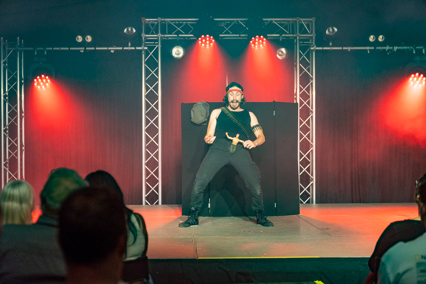 Dugmore as Colonel Man Syndrome stands at the door on arrival, dressed in a camo jacket, matching cap, aviators and holding a large bucket, handing out a colourful plastic ball to everybody, an enticing promise for later on…