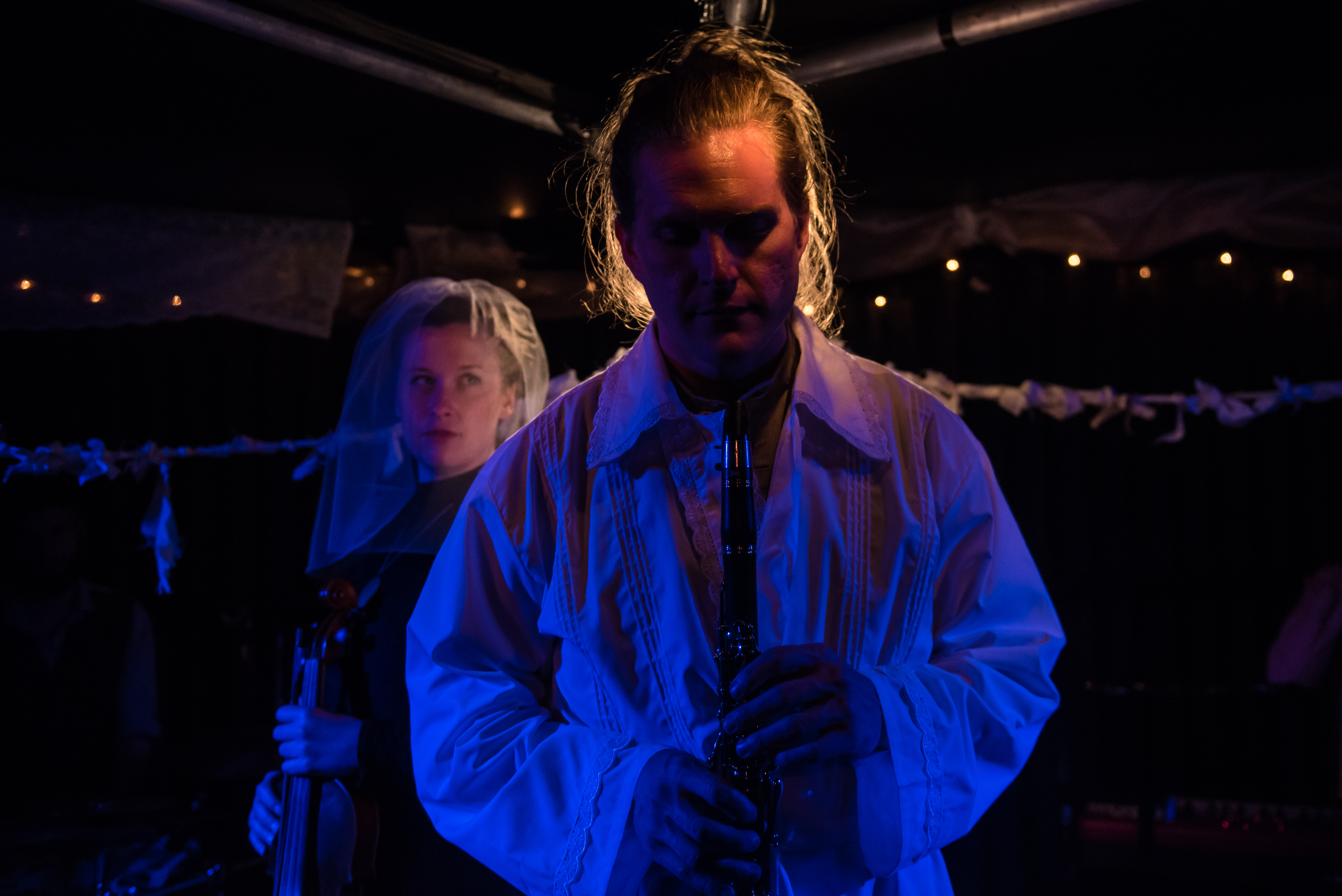 The story plays out inside the box-like set, with a samovar in the centre, some mismatched furniture and decorations loosely hung and strung, ably conveying the transitory feel of the couple’s lives. It is told through a series of key emotional moments, punctuated by musical numbers played by the cast and two accompanists, and sometimes sung and played entirely outside the box by our rambunctious host (Ben Caplan).