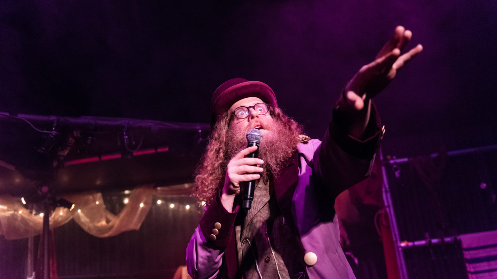 The story plays out inside the box-like set, with a samovar in the centre, some mismatched furniture and decorations loosely hung and strung, ably conveying the transitory feel of the couple’s lives. It is told through a series of key emotional moments, punctuated by musical numbers played by the cast and two accompanists, and sometimes sung and played entirely outside the box by our rambunctious host (Ben Caplan).