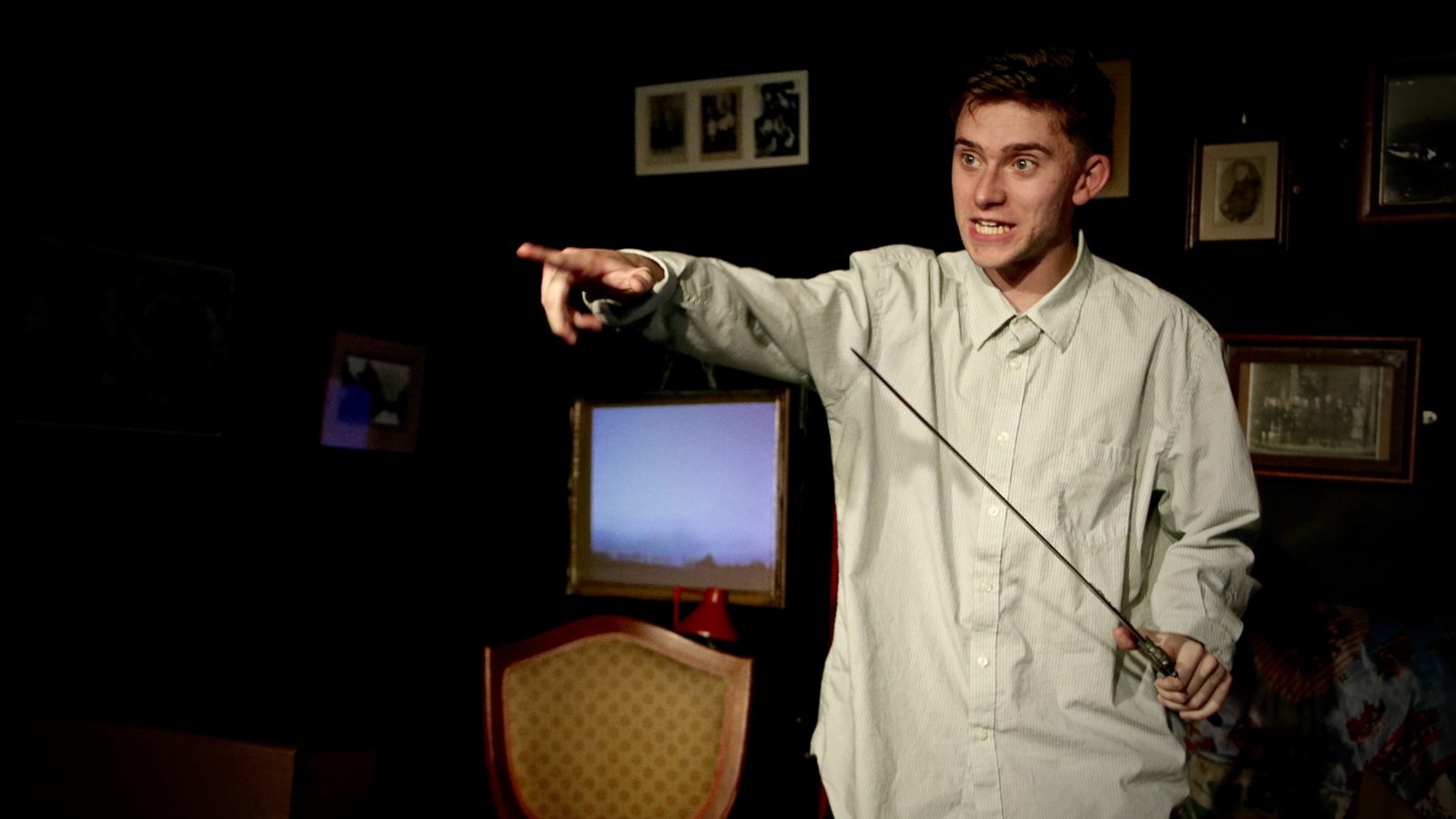 Two other elements also add greatly to the atmosphere. Emer Clark’s set couldn’t be more authentic and immersive. The walls are lined with sepia family portraits; the old gramophone with its stack of 33s and 78s sits just upstage from the armchair from which reminiscences and recriminations have flowed; and, there’s also a handsome sword, cue for a vivid tale from the family annals.