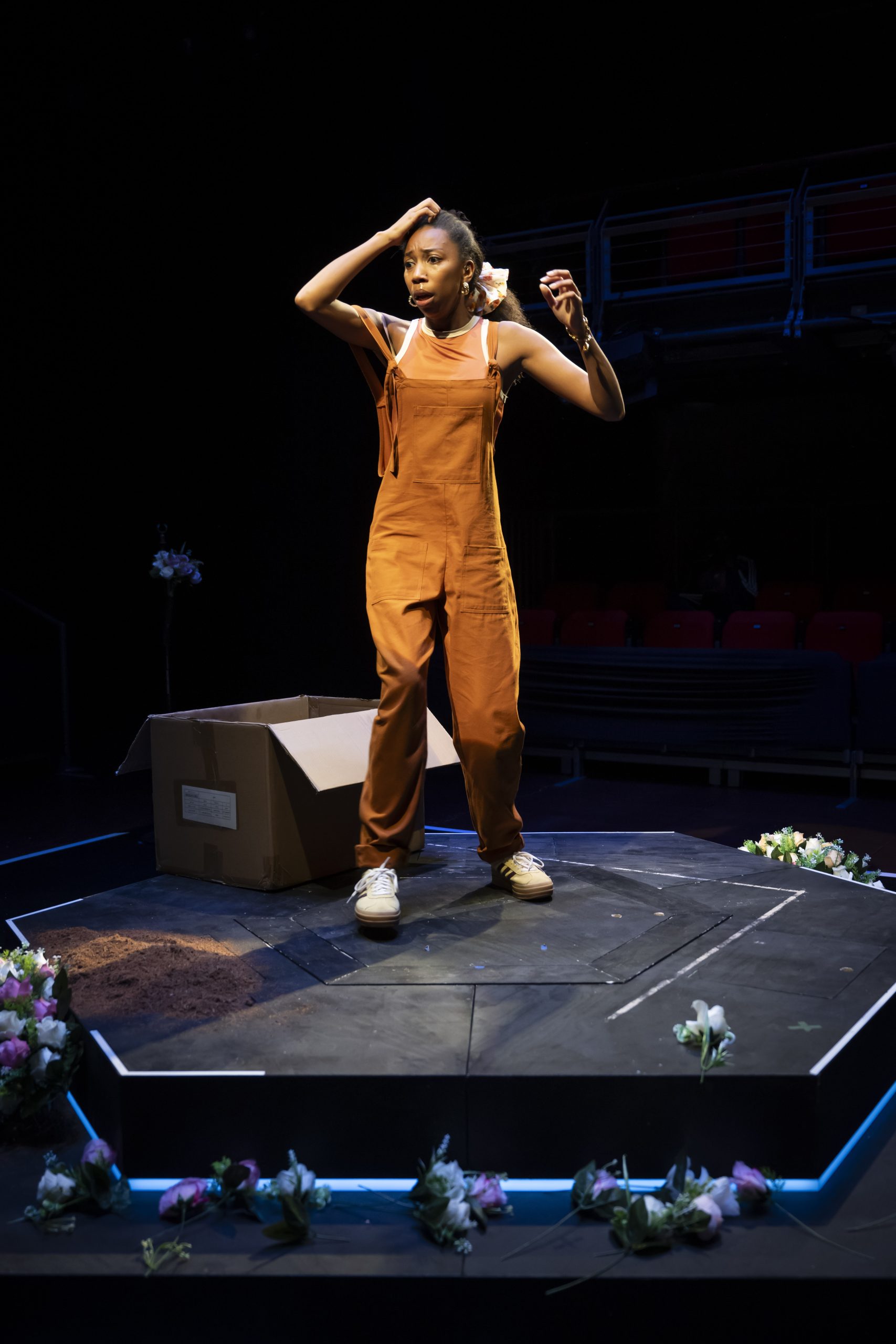 My Mother’s Funeral: The Show begins with Abigail (Nicole Sawyer) tentatively approaching the microphone on a centrally raised dais. She is about to speak but is taken aback by us, the audience, staring at her before shrinking back into herself. Dare she tell her story?