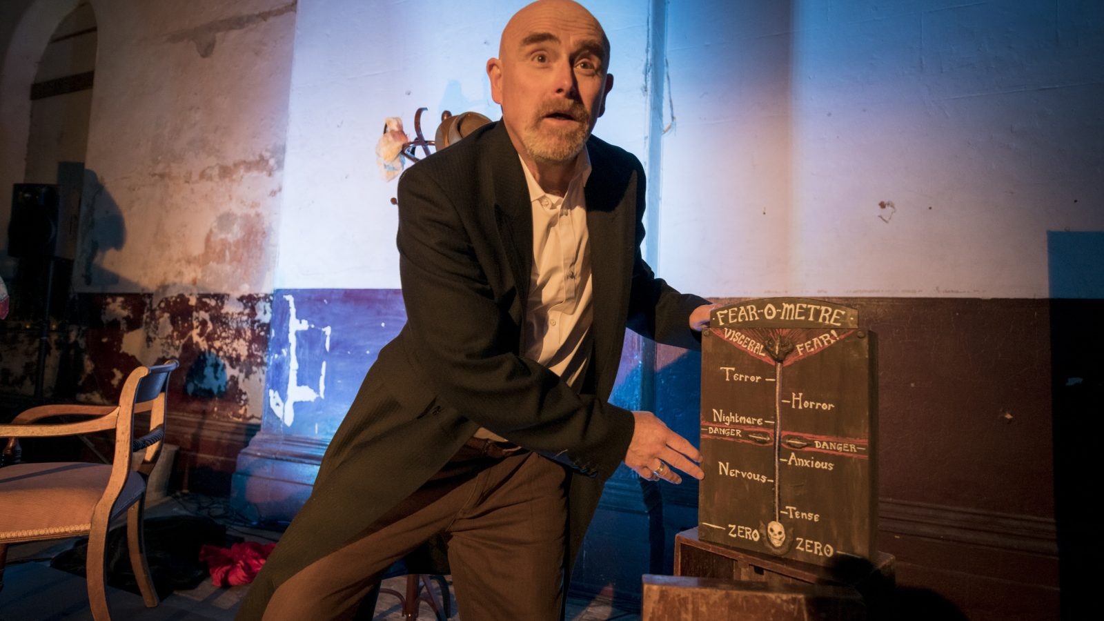 Llewellyn stages a bold one-man show, marooning a chair against a haunting castle backdrop and drawing the audience in as co-conspirators – at some points witnesses and at others participants. The performance shifts between parody, pastiche, and genuine unease. With each abrupt break in character, an explanation of Aldcroft’s rationale slices through the unsettling tension while reinforcing the absurdity of the piece.