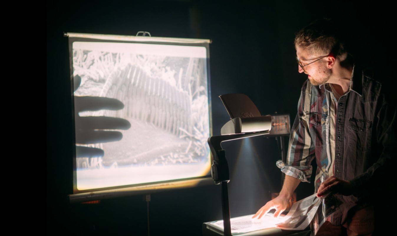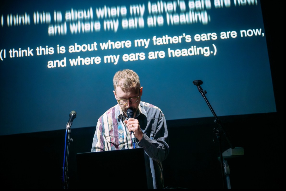 It’s another drizzly evening, and we settle into a packed room at the compact and modern Weston Studio, the show’s home for the next two weeks. The stage setup is simple: before us are two mics and a table with a laptop and a loop station on it, behind which is a screen with captioning.