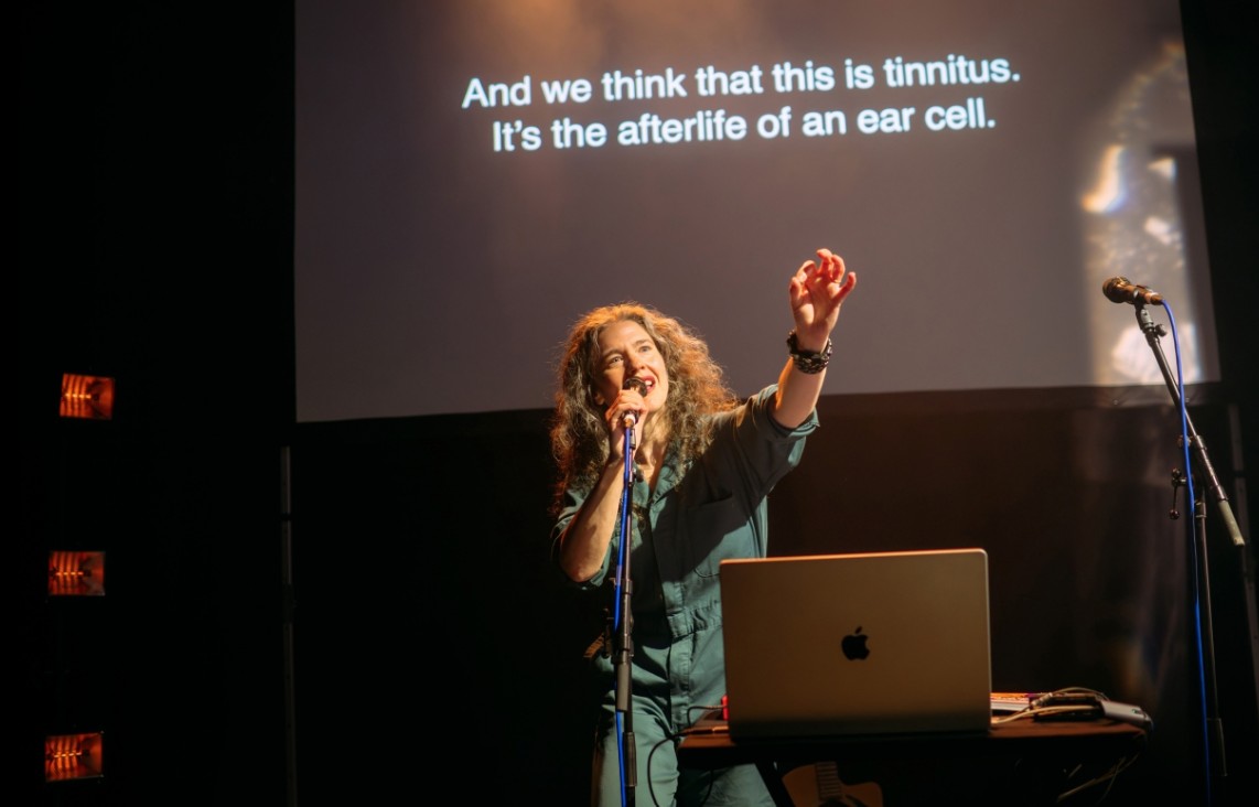The audience are often invited, but not pressured, to be a part of the songs, and it feels like a genuine and gently communal experience. The ones covering Shaun’s transition into atheism, the biology of hearing loss, and the difficulties of Abigail’s delivery are especially powerful, and enhanced by low-key but powerful lighting (Bethany Gupwell) and staging (Cate McCrae).