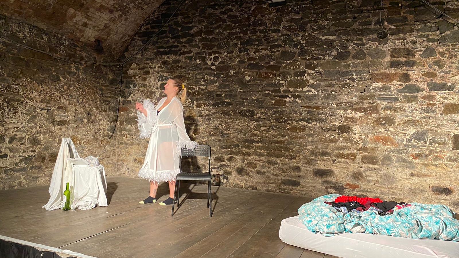 Meg Pickup, 32, looks younger than she is but her Patsy Stone-esque character illuminated the impression of maturity and sass. She stood in confidence under the yellow spotlight, nursing her glass of cheap wine in a crystal white transparent gown and feather tassels with black undergarments.