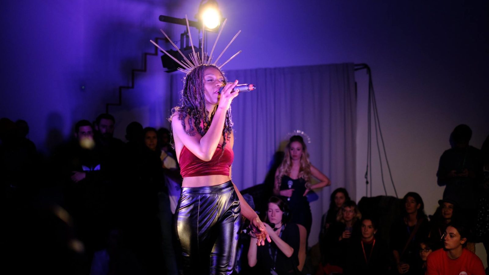 Peppy presenter Jadine takes to the stage to introduce the stars of the evening, eliciting genuinely excited whoops from the crowd as she runs through the £200,000 cash prize and potential contracts with the likes of Sony and the Royal Shakespeare Company. With a final round of applause, the cast, including talented young singers and dancers from Rise Youth Dance and Studio 7, take off up the stairs to set the stages for their first scenes. These take place across several floors of the Arnolfini, and it is the job of the production team from Bath Spa University‘s film programme to guide their section of the audience to each part as it unfolds.