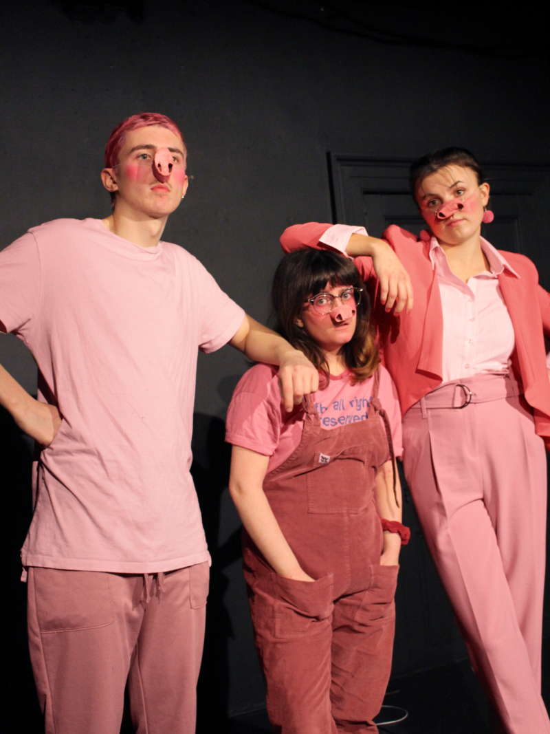 The three little pigs (Eve Biard, Jack Lord and Nicholas Alexander) are played with a boundless energy and neat comedic delivery. They encourage active audience participation where the usual greeting from one of the pigs, Stick “Oink, oink mother*******!” meets with a raucous “Mother******* oink, oink!” response from the audience.
