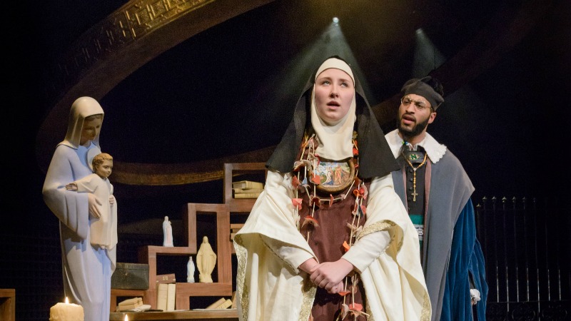 The symbolic set is formed of two concentric circles, one for Juana’s study and one for the other scenes, where iron gates both protect and constrict. At one point, the nuns’ elaborate headdresses get a laugh and rightly so: Lizzy Leech’s costumes are lavish and well-constructed.