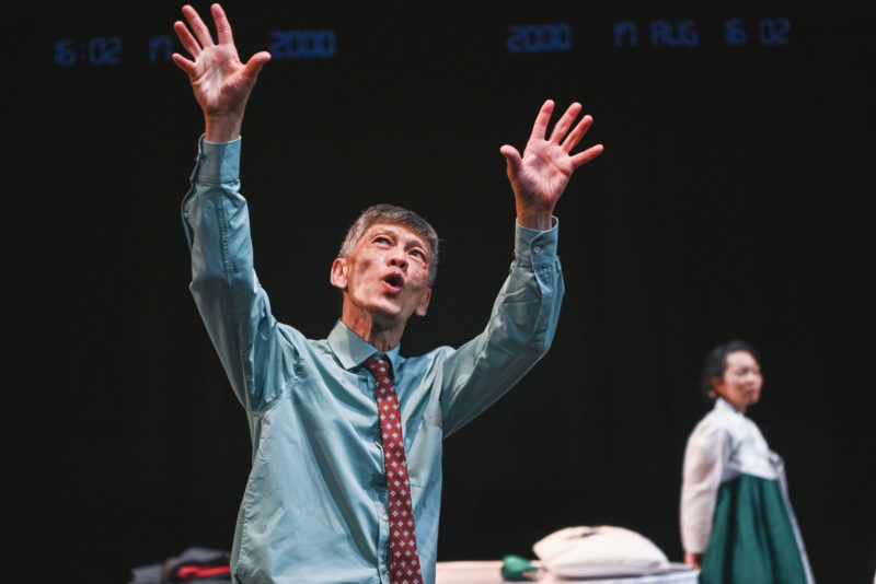 We first meet Kwong Loke as the father and Jung Sen den Hollander as grown-up daughter while they falteringly look for each other in a bland conference space, their bodies twisting and bending awkwardly, with pained expressions on their faces as they try to spot numbers on lapels indicating their family connection.