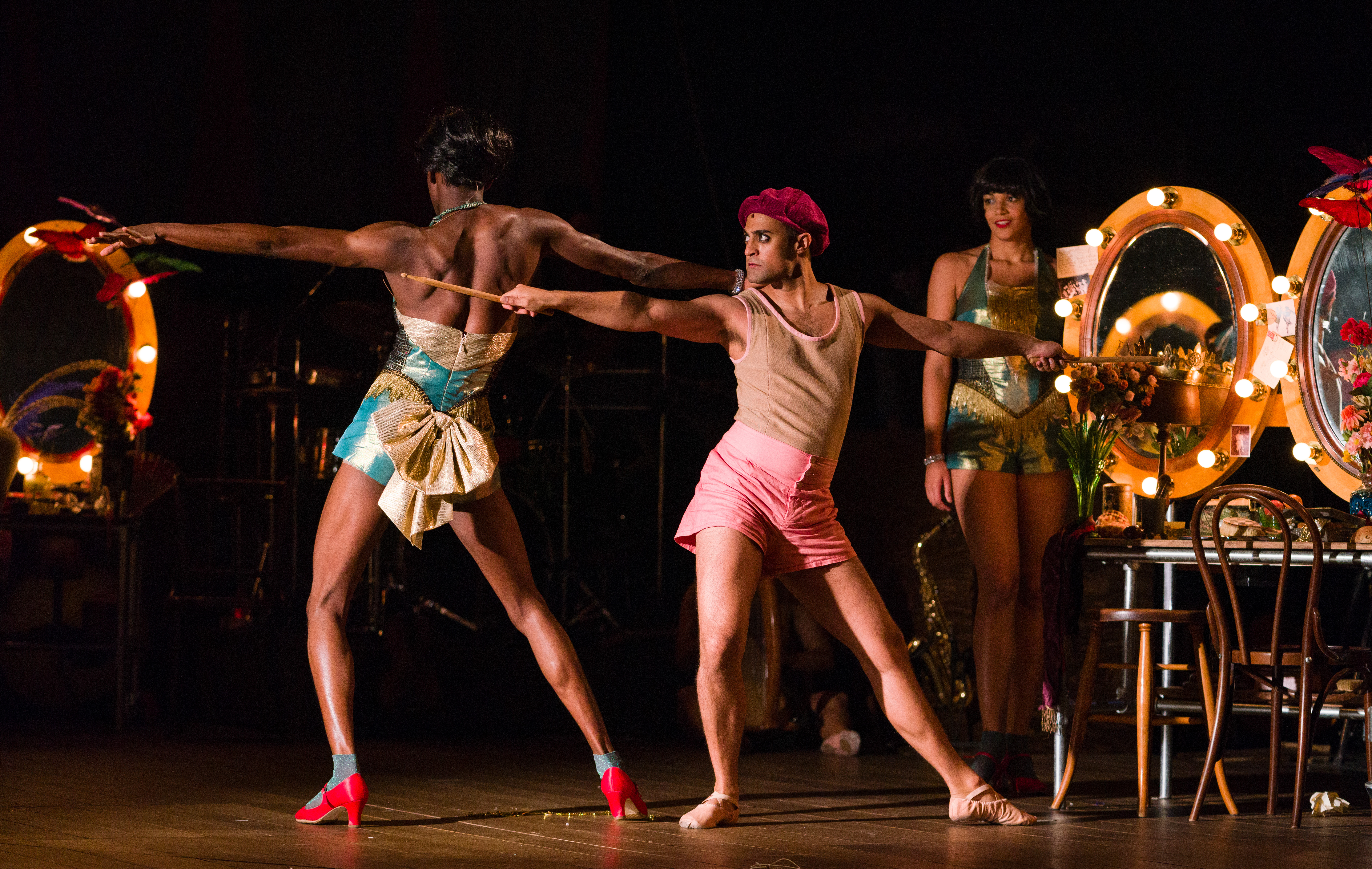 In glitter one-pieces and short bobs, the girls’ transformation also unravels as time warps, their identity unfurling. Showgirl Dora, played by Melissa James with the reserved look of a young woman in thrall of her more provocative sister, and Showgirl Nora, played by Omari Douglas with a twirling lightness and a masterfully assured sense of the possibilities of camp, mould the Chance twins’ story into a farce of gender and identity.
