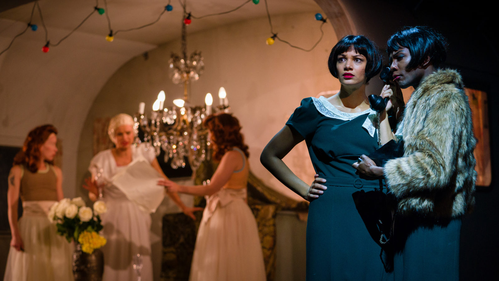 In glitter one-pieces and short bobs, the girls’ transformation also unravels as time warps, their identity unfurling. Showgirl Dora, played by Melissa James with the reserved look of a young woman in thrall of her more provocative sister, and Showgirl Nora, played by Omari Douglas with a twirling lightness and a masterfully assured sense of the possibilities of camp, mould the Chance twins’ story into a farce of gender and identity.