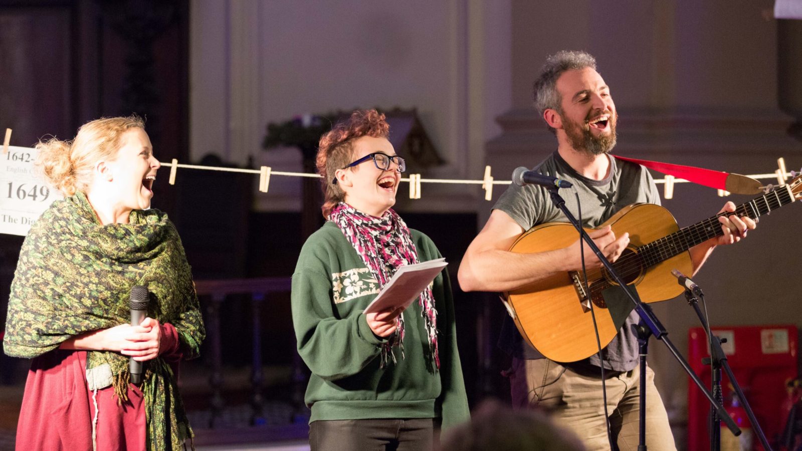 Equipped with a ukulele and a book of protest songs, Three Acres and a Cow took to the stage on Saturday evening to perform a sold-out show at All Hallows Hall in Easton.