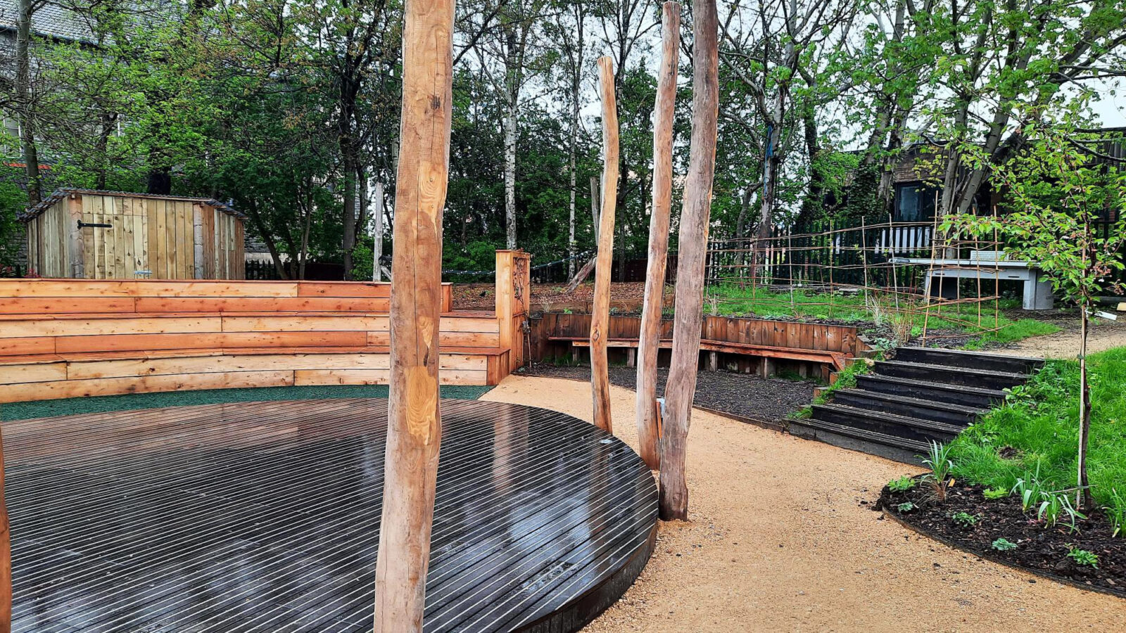 Three-tiered curved seating surrounds a central performance area made of bamboo decking, and the thoughtfully screened and landscaped space presents a natural haven in the middle of Bristol.