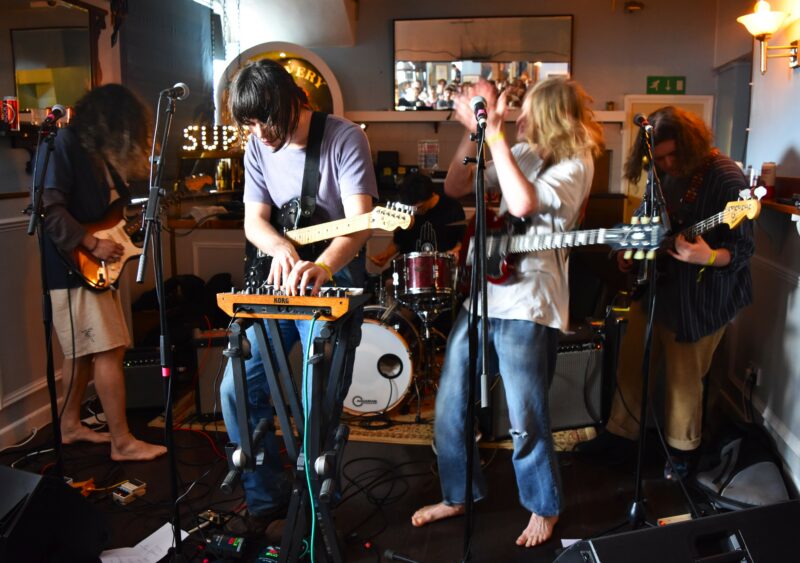 I move downstairs for The Clangers. Another local outfit, they’re just as noisy but with a more playful feel. Their look and sound steals from the rural punk aesthetic of ‘90s Portland – barefeet, blonde curtains, short sleeves over long – with added harmonica and korg.