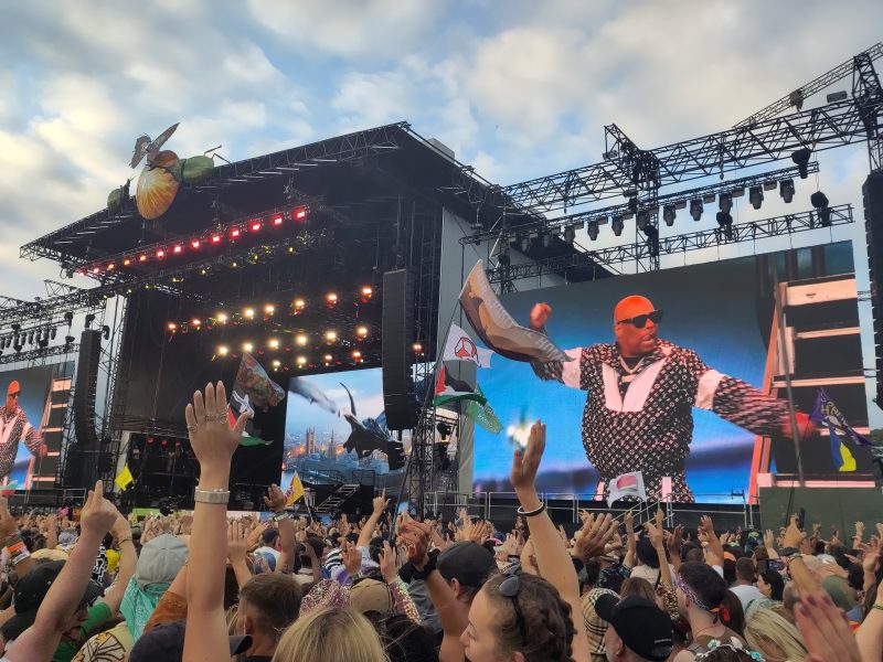 She is not the first or last this weekend to call to “free, free Palestine,” with the crowd responding resoundingly in kind every time. When Kneecap do the same, one man calls ‘and Ukraine’ in the country’s native language.