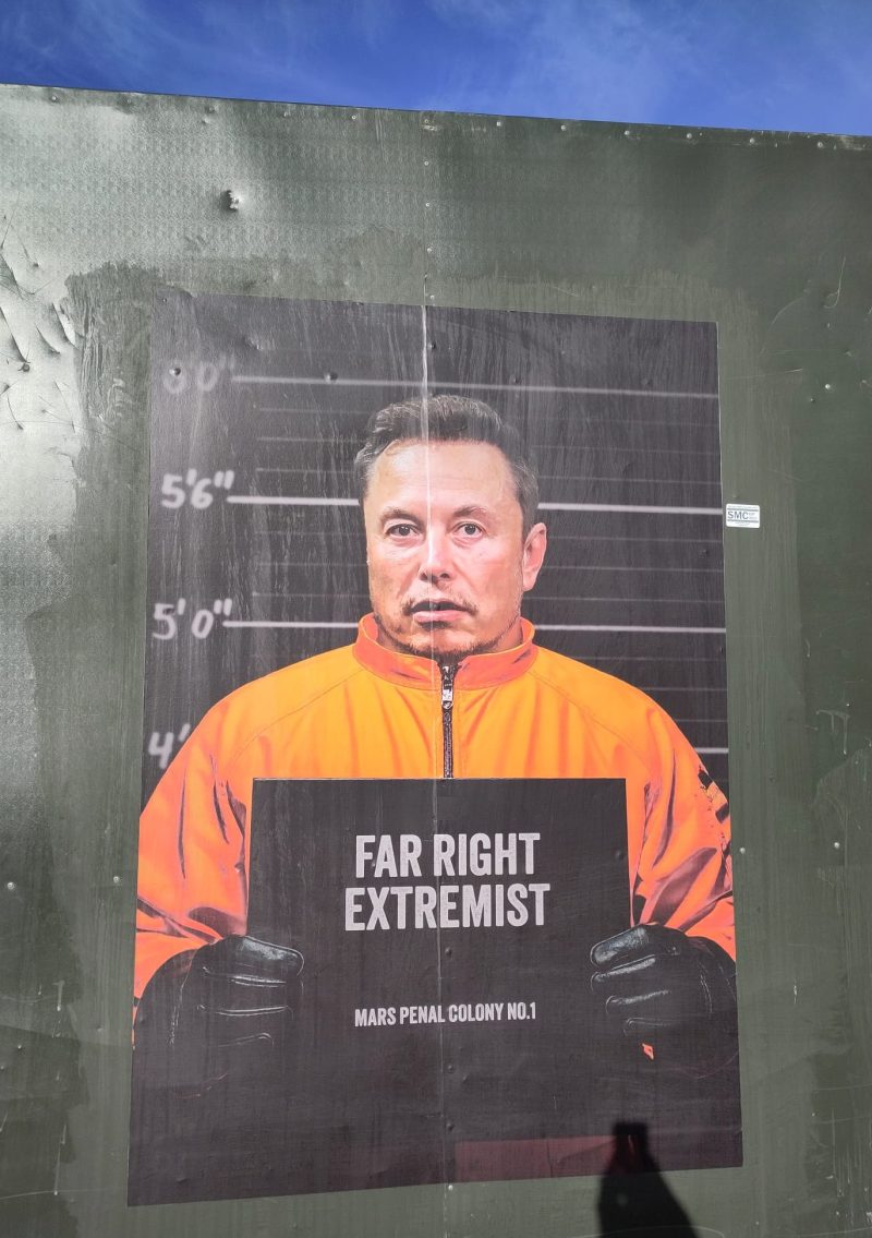 Signs of protest and defiance abound – alongside this image calling out Elon Musk were similar images of Mark Zuckerberg, described as a ‘spreader of dangerous lies’ and Jeff Bezos, ‘tax avoider’ – photo: Ursula Billington
