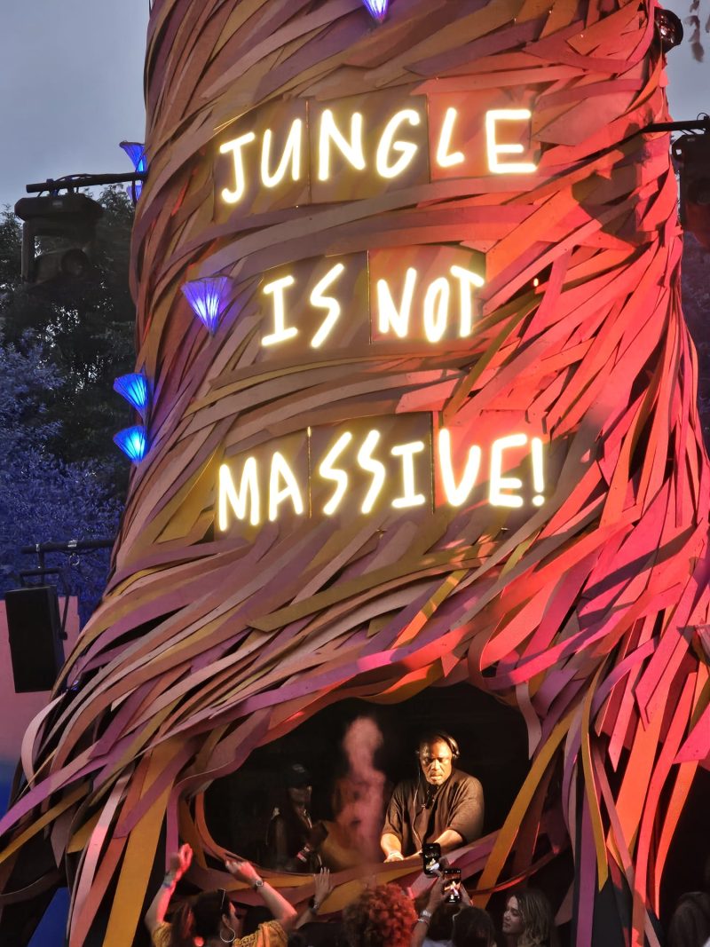 The Greenpeace area celebrates the power of protest, the huge tree at its heart screaming about environmental destruction (yes, that is Idris Elba. DJing. In a tree) – photo: Amy Blue
