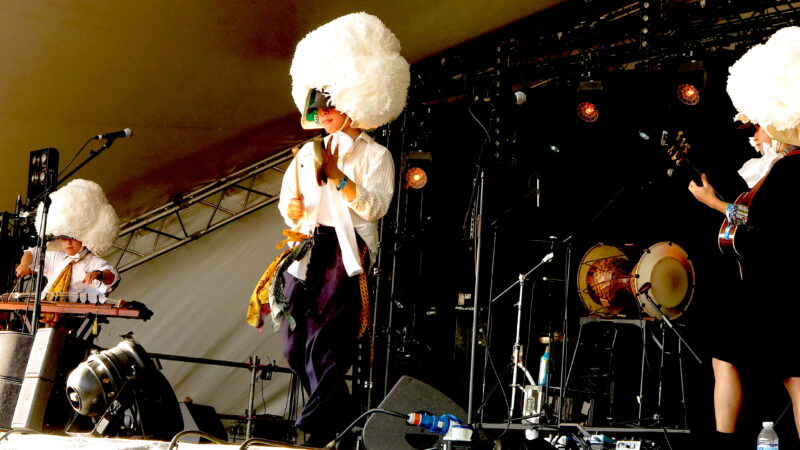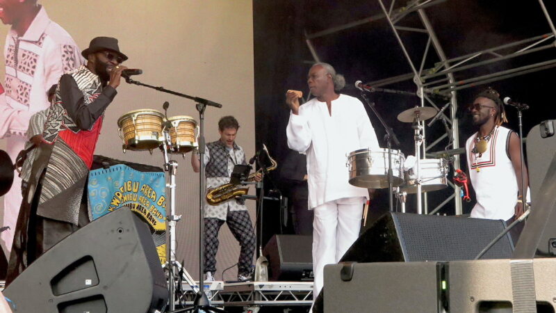 But what of the boys? Well, South Korean trio Sangjaru were an unexpected treat, veering from K-pop into drivingly heavy rock, then Shamanistic rituals before ending up with cafe swing – all conjured from traditional Korean instruments plus bass guitar. It was truly awesome, literally topped off with enormous hats. Similarly original sounds came from Nana Benz de Togo, the three (female) vocalists backed by a man playing an instrument made from plastic drainpipes hit with flip flops. Their upbeat songs about women’s rights were also eminently danceable, but searing afternoon sunlight kept most people sitting down – unlike the later reception for TC and The Groove Family. They kept a rammed Soundscape tent deliriously on their feet later that evening with a well-chosen mish-mash of grooves and virtuosos jazz soloing.