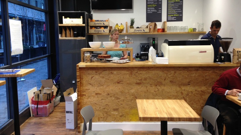 A television remains on one wall which will no doubt continue to show cycling events. The counter is covered in trendy chipboard, there are grey plastic and wooden chairs, and a view across to Pizza Express one way and a selection of garishly coloured running shoes the other way.