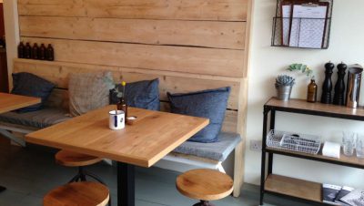 Stepping into the café towards the top of the Gloucester Road near the Memorial Stadium, a set of tall modern chairs face the floor to ceiling window, which brings drenching light and warmth into the room.