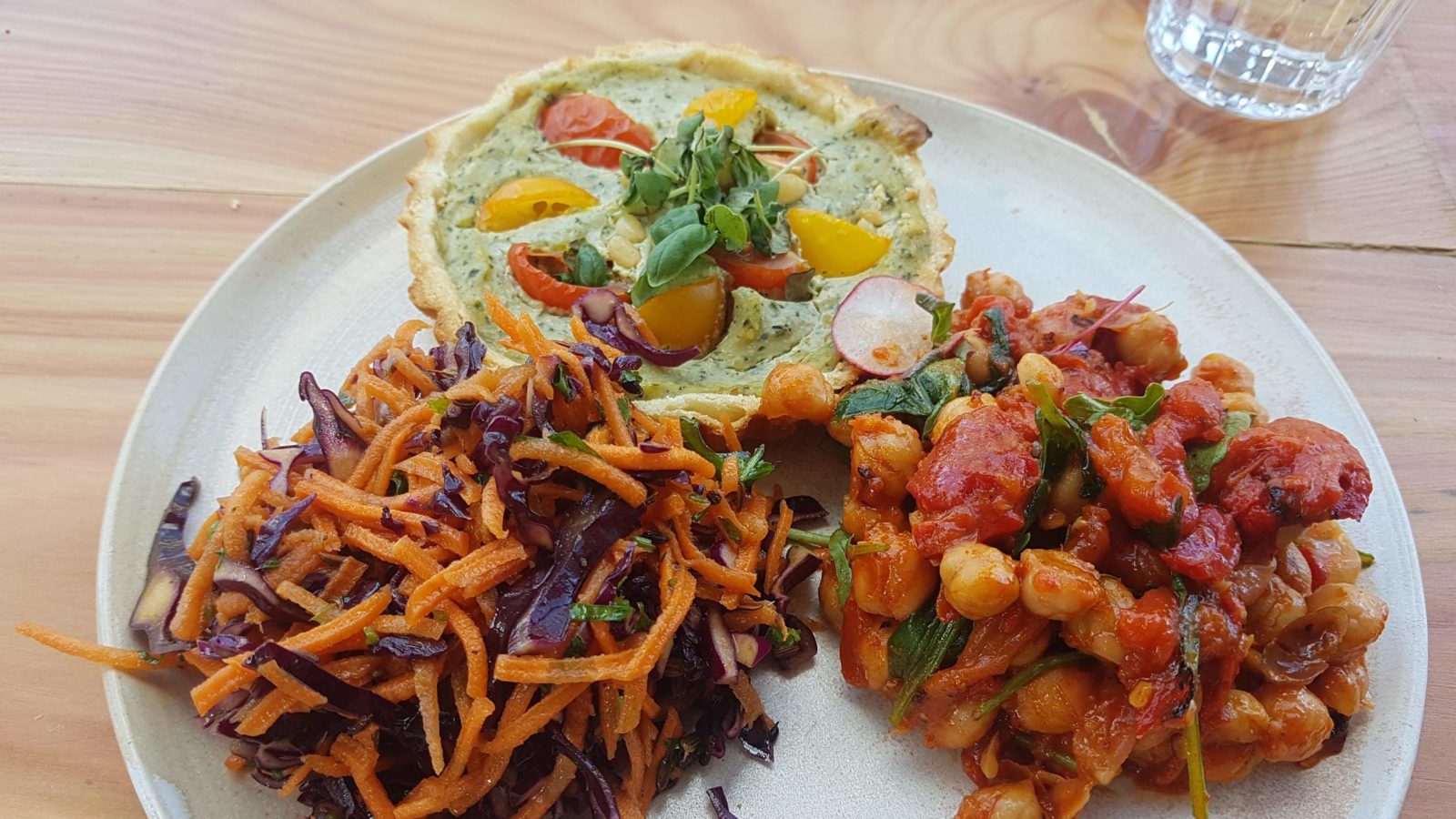 The odd jug of fresh flowers add a splash of colour to the understated décor, but the eye is mainly drawn to the shelves filled with vegan goods and the counter, which hosts vast bowls of olives, salads and a variety of hummus, as well as quiches and ‘non-sausage’ rolls.