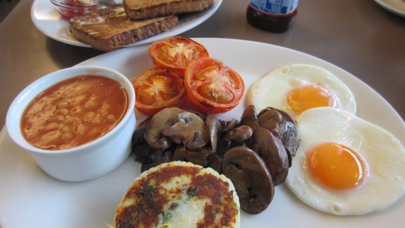A large plate arrived promptly, but this was not the veggie breakfast I was so anticipating. No, this was just the first course of toast. A good thick couple of slices served with a generous slab of butter and a choice of jam or marmalade (or both) – all included in the £6.95 price.