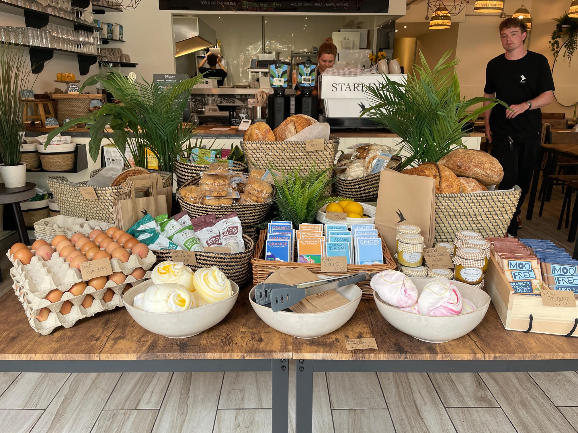 In the four days that they’ve have been open they have already managed to bag some repeat customers, evidenced by the jokes being exchanged over the Starlings branded coffee machine. The front of the café-cum-wine bar is also a deli, and upon arrival you are greeted by a table of fresh loaves, eggs, chocolate, and mountainous meringues.