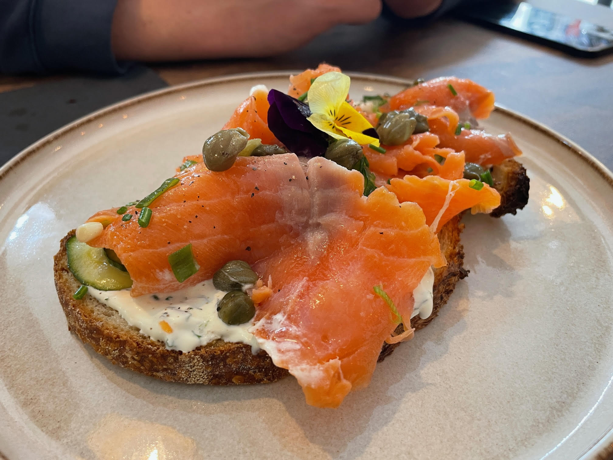 Now for the showstopper, Nordic sourdough (£9.50) described as gin-cured salmon, pickled cucumber, herb crème fraiche on toasted sourdough. If my handshake had as much gravitas as Paul Hollywood’s (although I’m not sure he’s something to aspire to) then I would have given them one for the Nordic sourdough. All the brunch dishes were good, but this was the epitome of smoked salmon. This is where every salmon, desperately swimming up that hill would make a deal with God to end up. Thick cut, gin-cured, meaty. The crème fraîche’s fraîche-ness boosted by the addition of dill, the cucumber lightly pickled but enough to wake you from any weekend slumber. The capers had clearly been going to the gym, huge and fit to burst. A feast for all the senses.