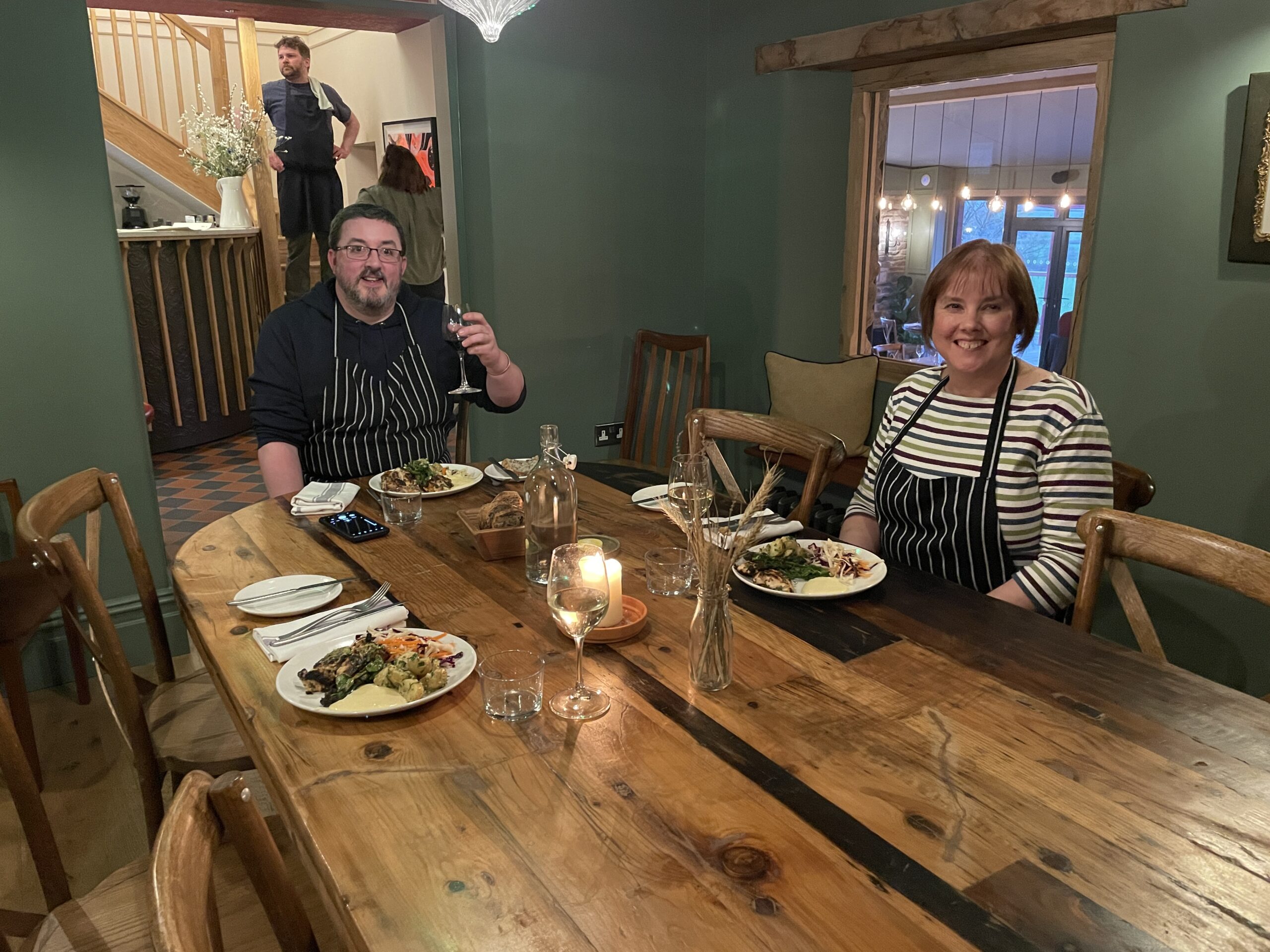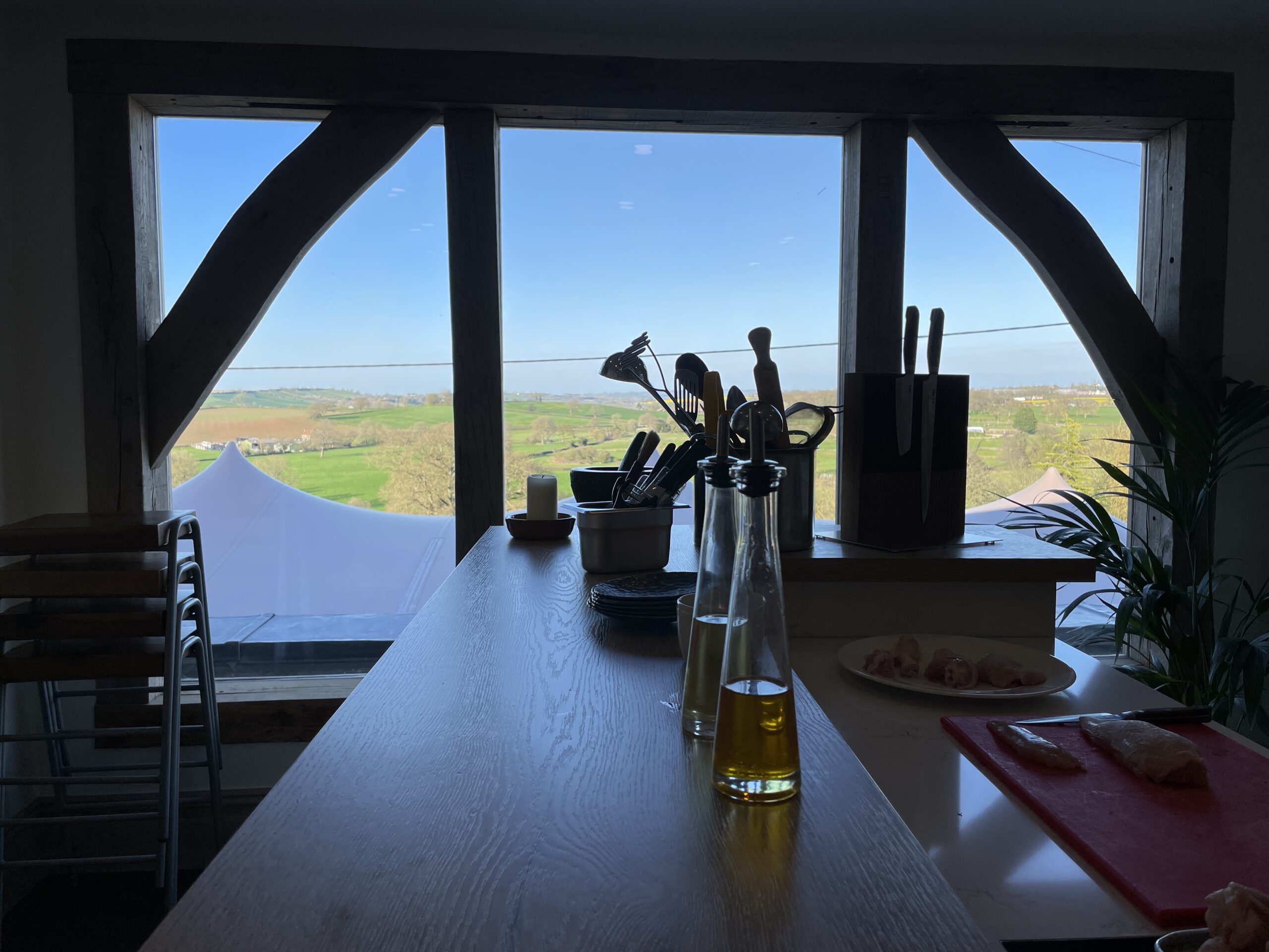 In the next room is a vast dining hall with floor to ceiling windows offering profound views of the Chew Valley; a garden and fields basking in the receding light. The views are continued upstairs in the demo kitchen, which is where some of this evening’s cooking class will take place.