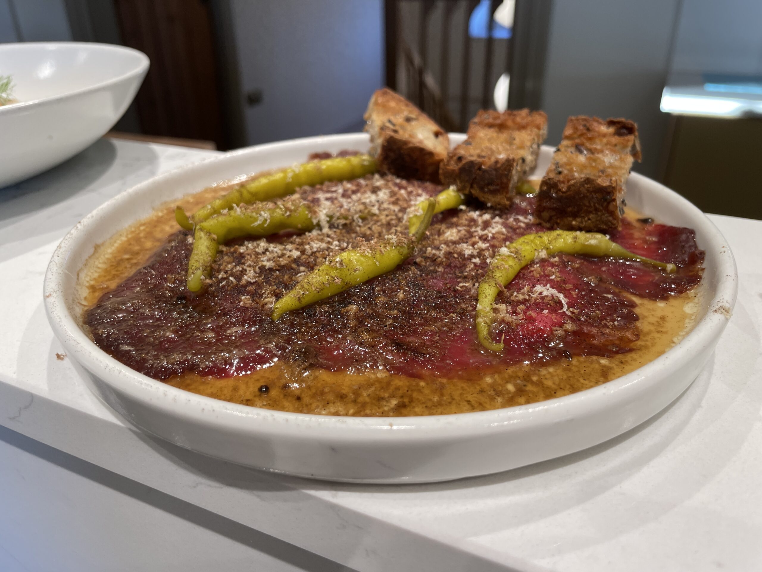 Venison carpaccio, bone marrow broth, smoked ox heart, guindilla chilli, sour cream and beef fat toast